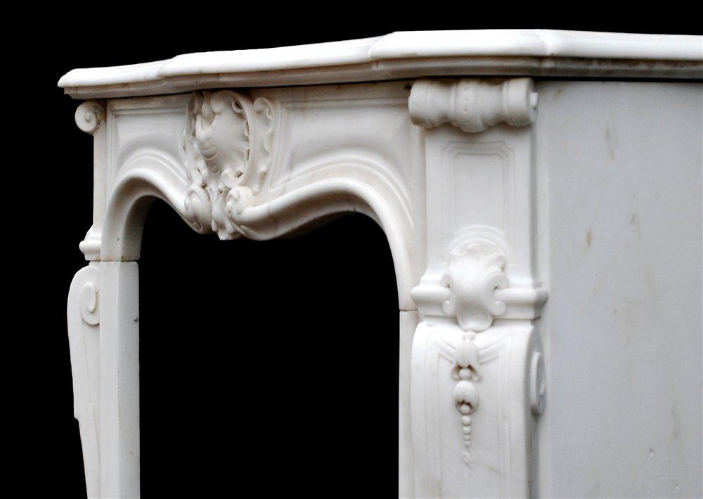 An unusually small French 19th century Louis XV style Statuary marble fireplace with carved centre to frieze and fluted shaped jambs surmounted by scrolls. Recommended for a small bedroom.