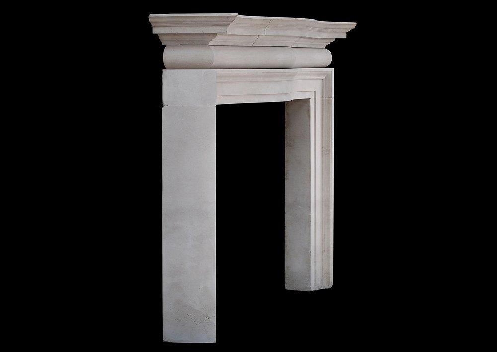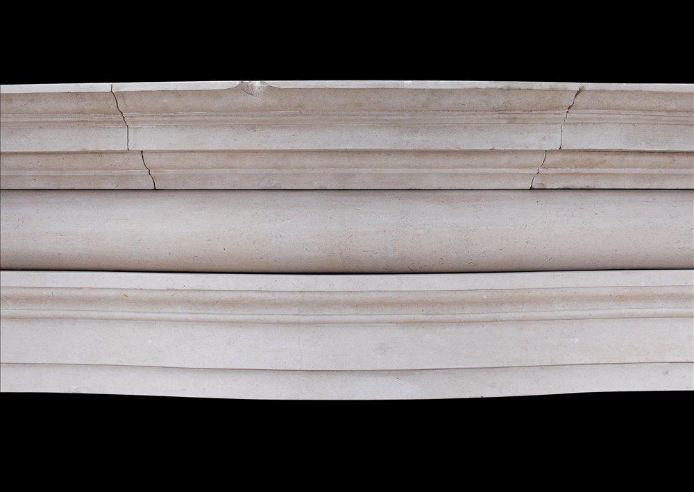 A large and imposing English Portland stone fireplace. The shaped barrel frieze surmounted by shaped, moulded shelf above. The heavy jambs with angled outgrounds. Circa 1900, quite possibly by Edwin Lutyens. A very impressive piece, which would suit either a traditional or modern setting. Width of shelf at front: 64.75".