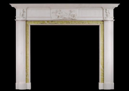 A petite Regency fireplace in Statuary and grey Bardiglio marble. The frieze with carved centre placed featuring Adam style urn and drapery. The tapering jambs surmounted by carved with and bell flowers. Moulded shelf above. 19th century.