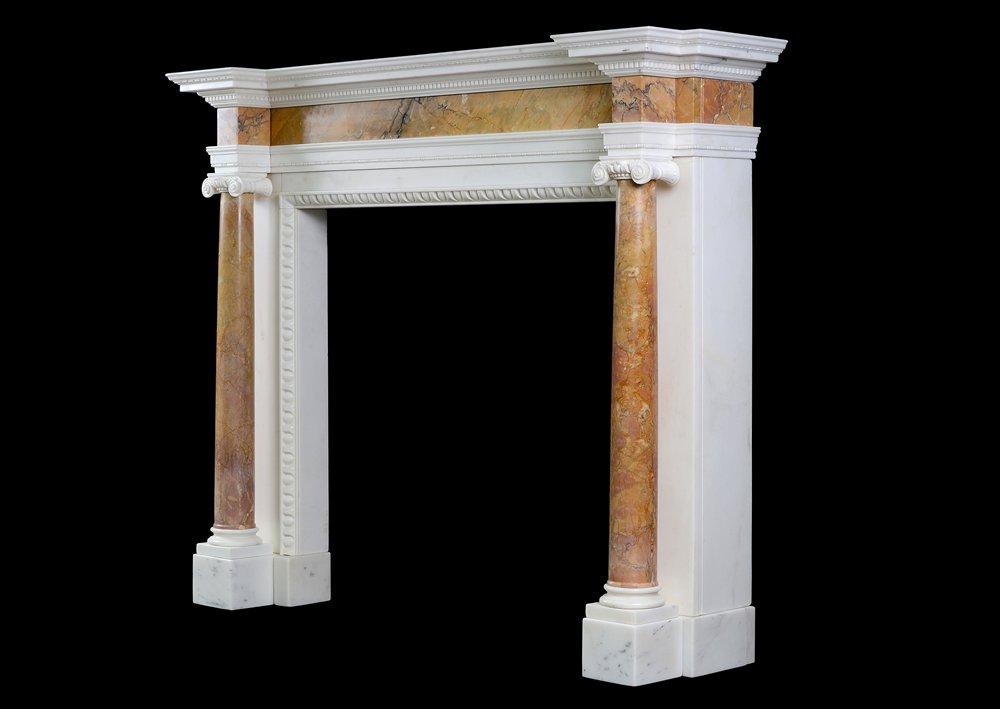 A medium scale George II English Siena and Statuary marble fireplace with columns. The carving of fine quality including leaf moulding and dentils to shelf, egg and dart inner moulding. The frieze and columns of Siena marble. Mid 18th century. An unusually small scale for this style of fireplace - very good quality.