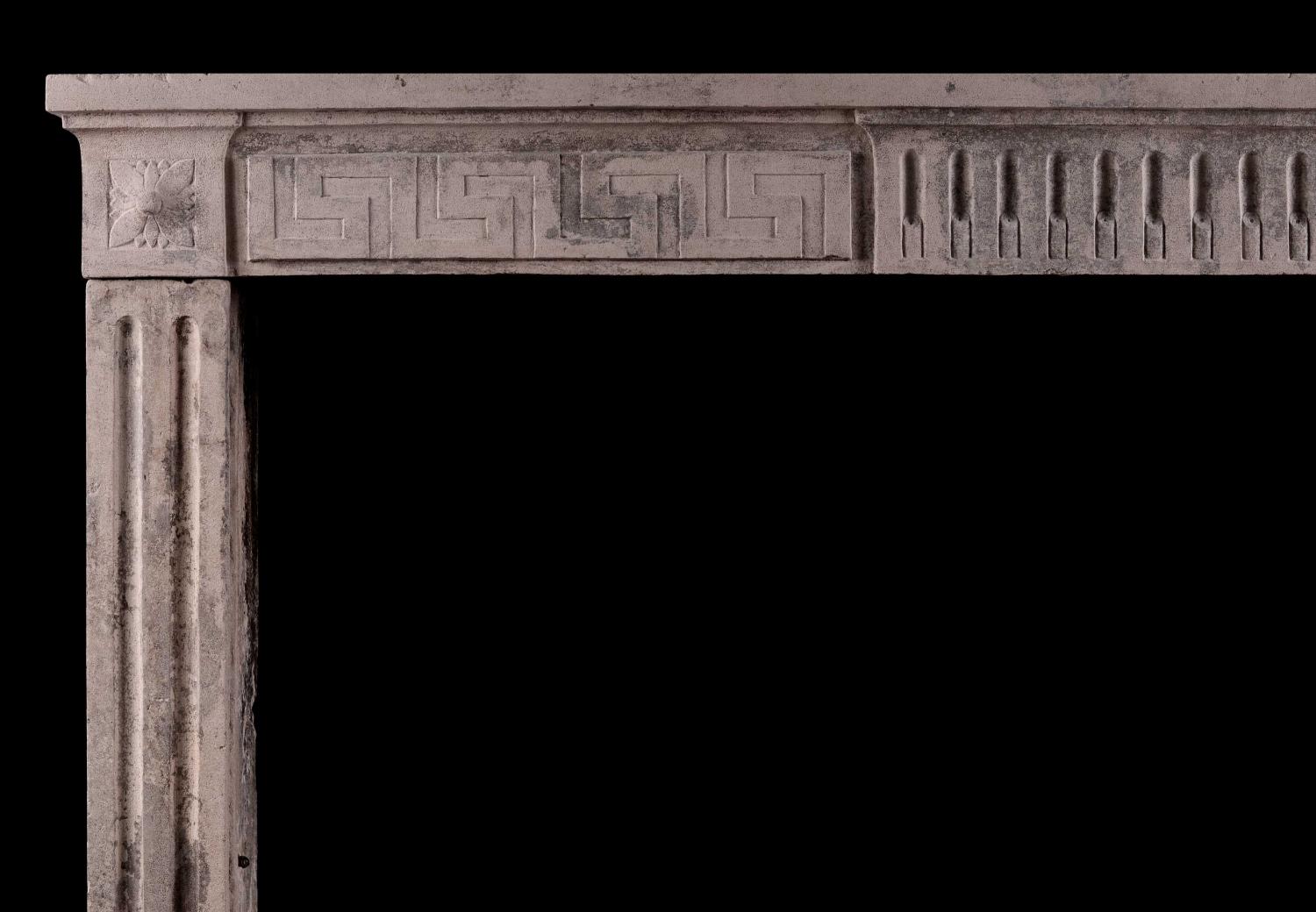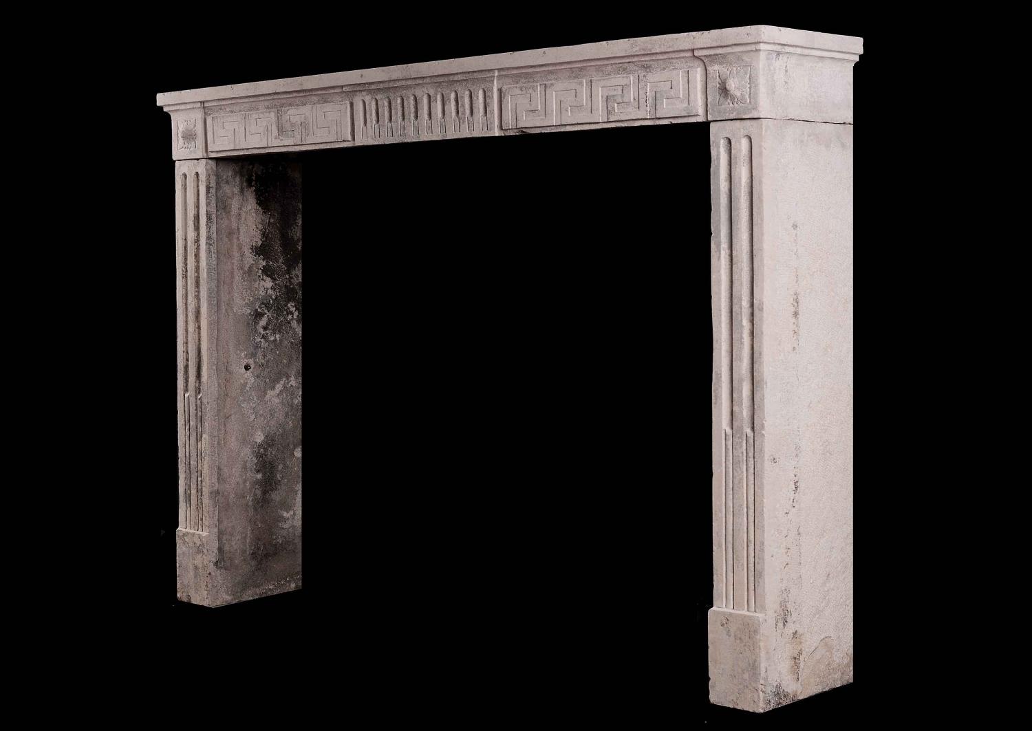 A rustic French period Louis XVI limestone fireplace. The frieze with stop fluting to centre panel and Greek key pattern. The fluted jambs surmounted by square carved paterae. Period 18th century. Some wear and patination consistent with age.