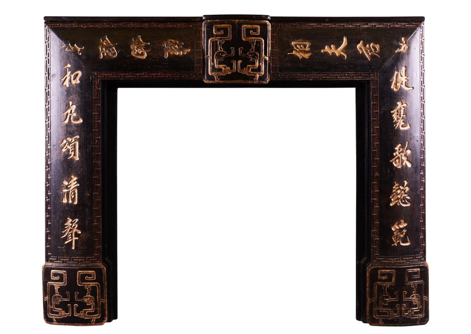 An architectural timber fireplace with Eastern influence. The jambs and frieze with Chinese symbols throughout, the plinths and centre block with matching motifs. English, 19th century.