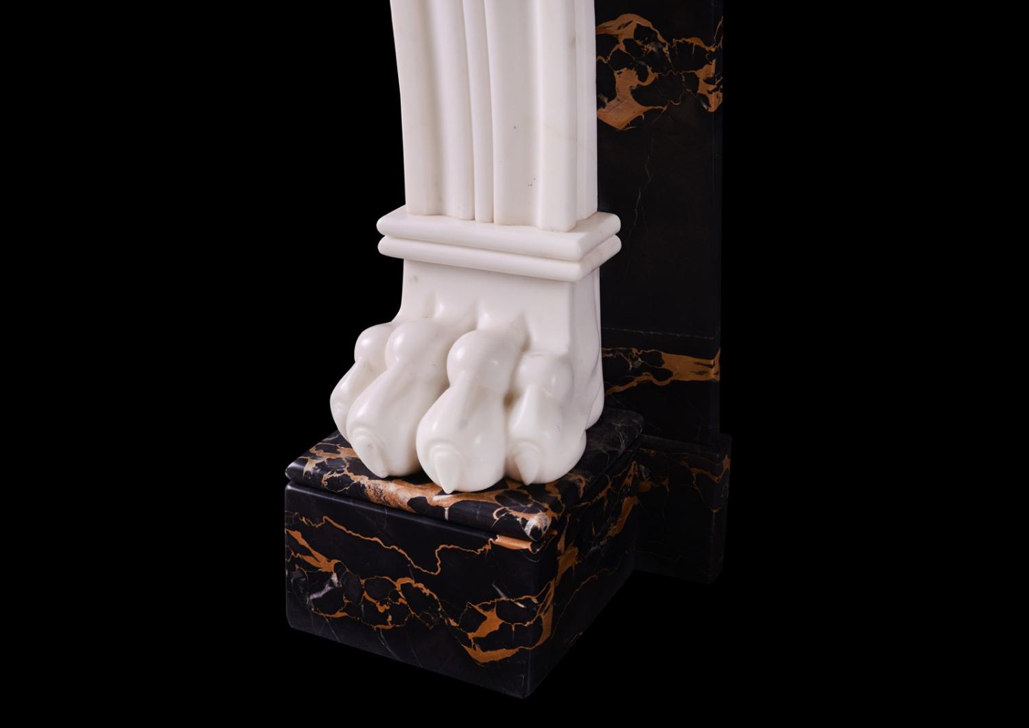 A high quality Italian Portoro and Statuary antique marble fireplace. The finely carved shaped fluted jambs with claw feet, scrollwork and foliage. The Portoro frieze with carved urn centre with guilloche and bellflower detailing. Portoro moulded shelf above. Italian, circa 1820.