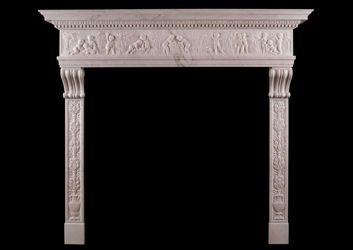 A very fine Statuary white marble fireplace in the Italian Renaissance manner. The carved jambs featuring classical amphorae surmounted by fruit, acorns, ribbons and foliage topped with finely carved scrolled brackets. The carved frieze with putti throughout surmounted by shelf with dentils and egg-and-dart moulding. A very fine piece, originally from Florence, Italy. 19th century.