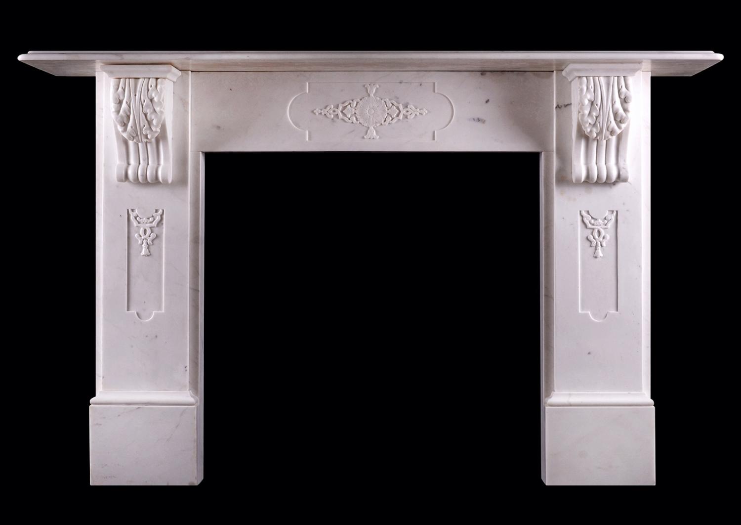 A good quality period Victorian fireplace in Statuary white marble. The jambs with corbels featuring acanthus leaves with decorative panels below. The frieze with centre panel carved with rosette and bellflower detailing. Moulded shelf above. English, mid 19th century.