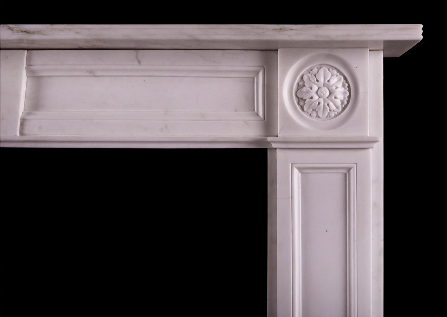 A white marble fireplace in the Regency style. The panelled jambs surmounted by matching frieze with keystone to centre, flanked by end blocks carved with rosette paterae. English, early 20th century.