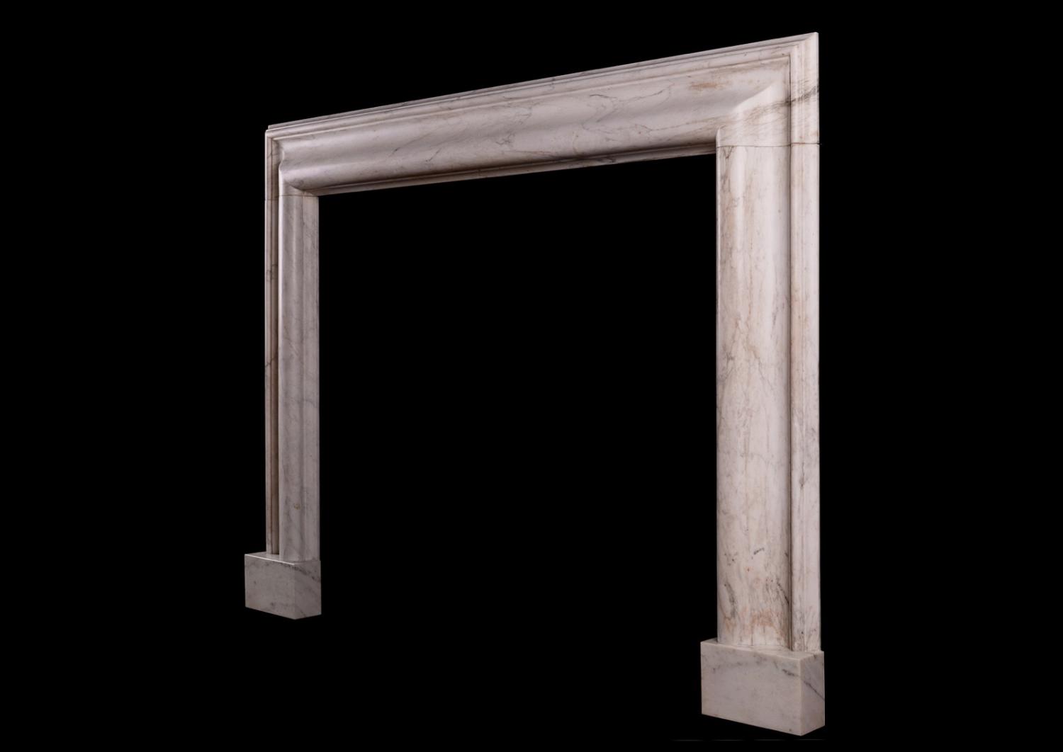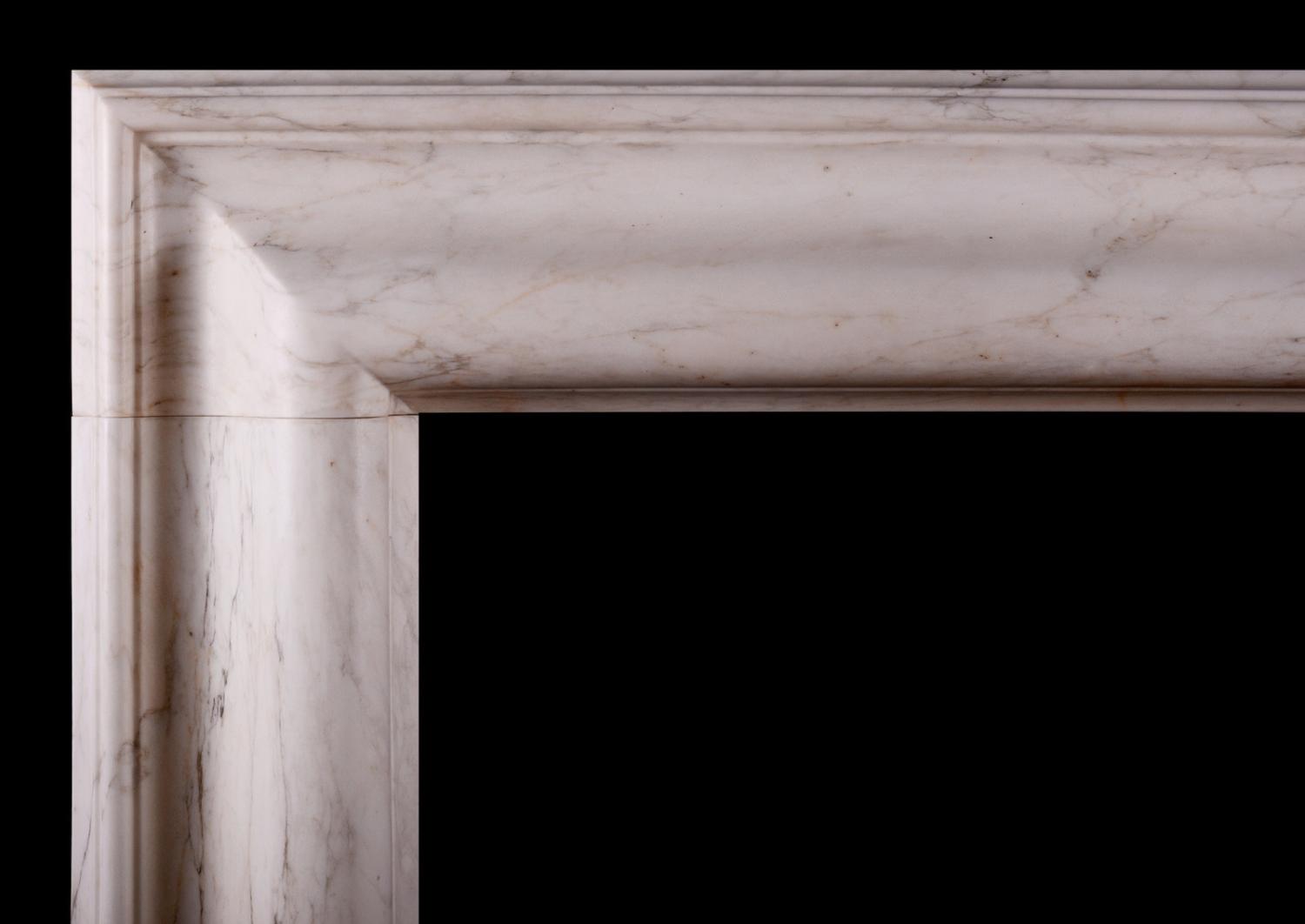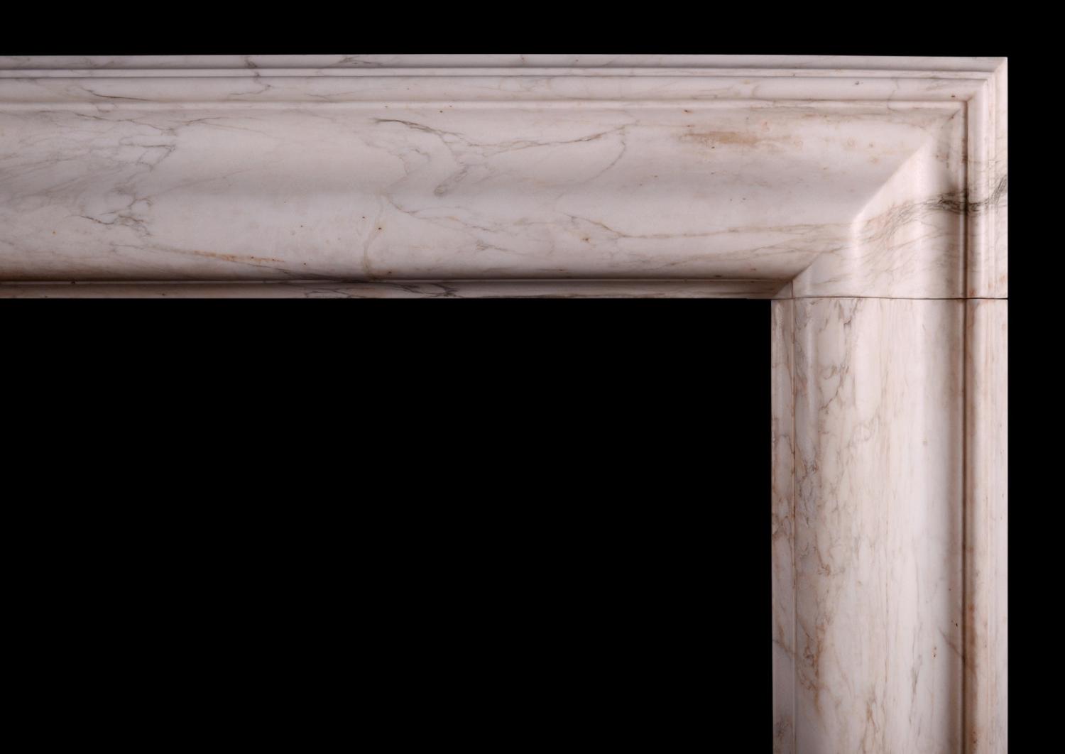 An English Statuary marble bolection fireplace. The moulded jambs and frieze in a pencil veined Statuary marble, with a warm hue. English, 19th century.