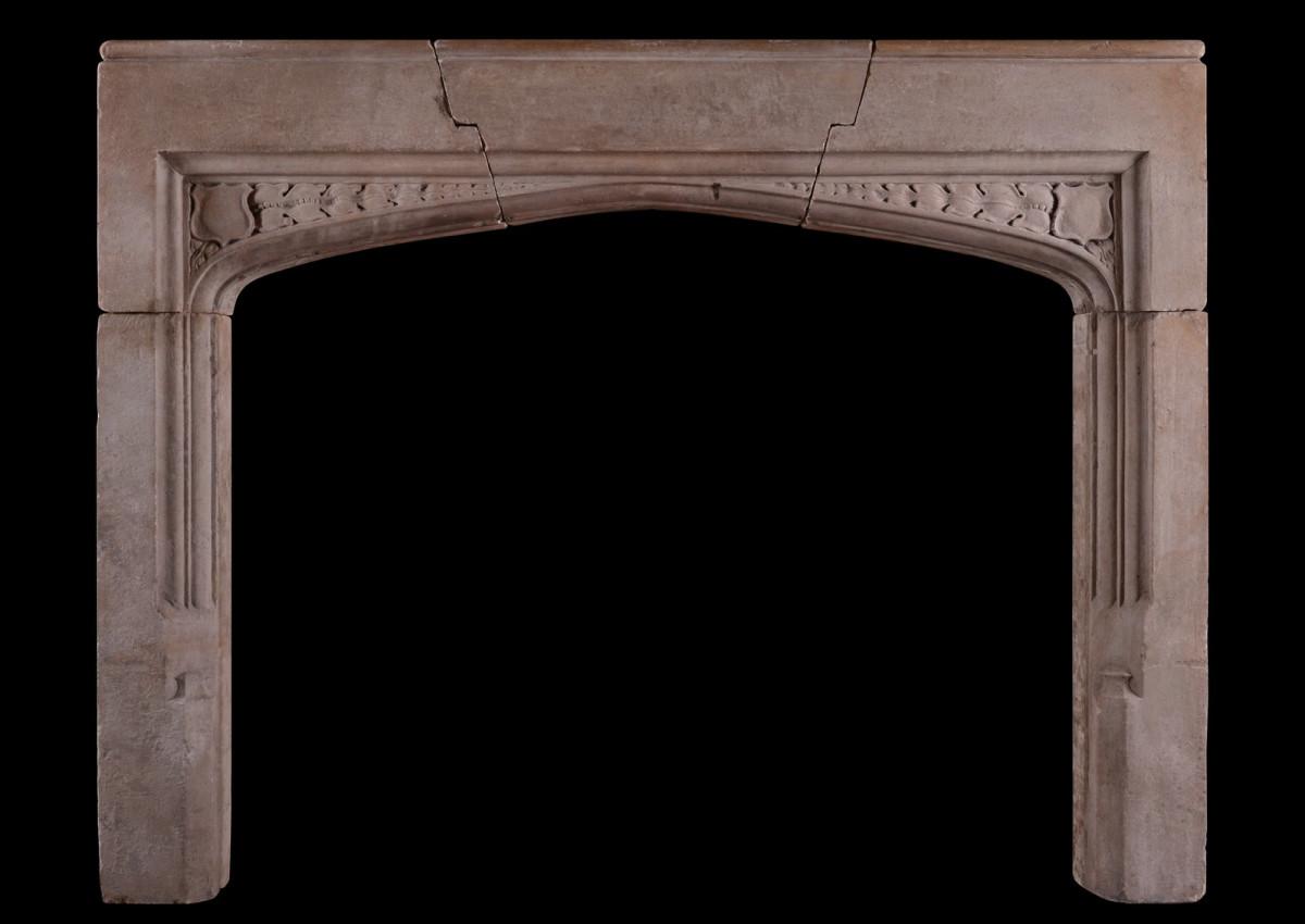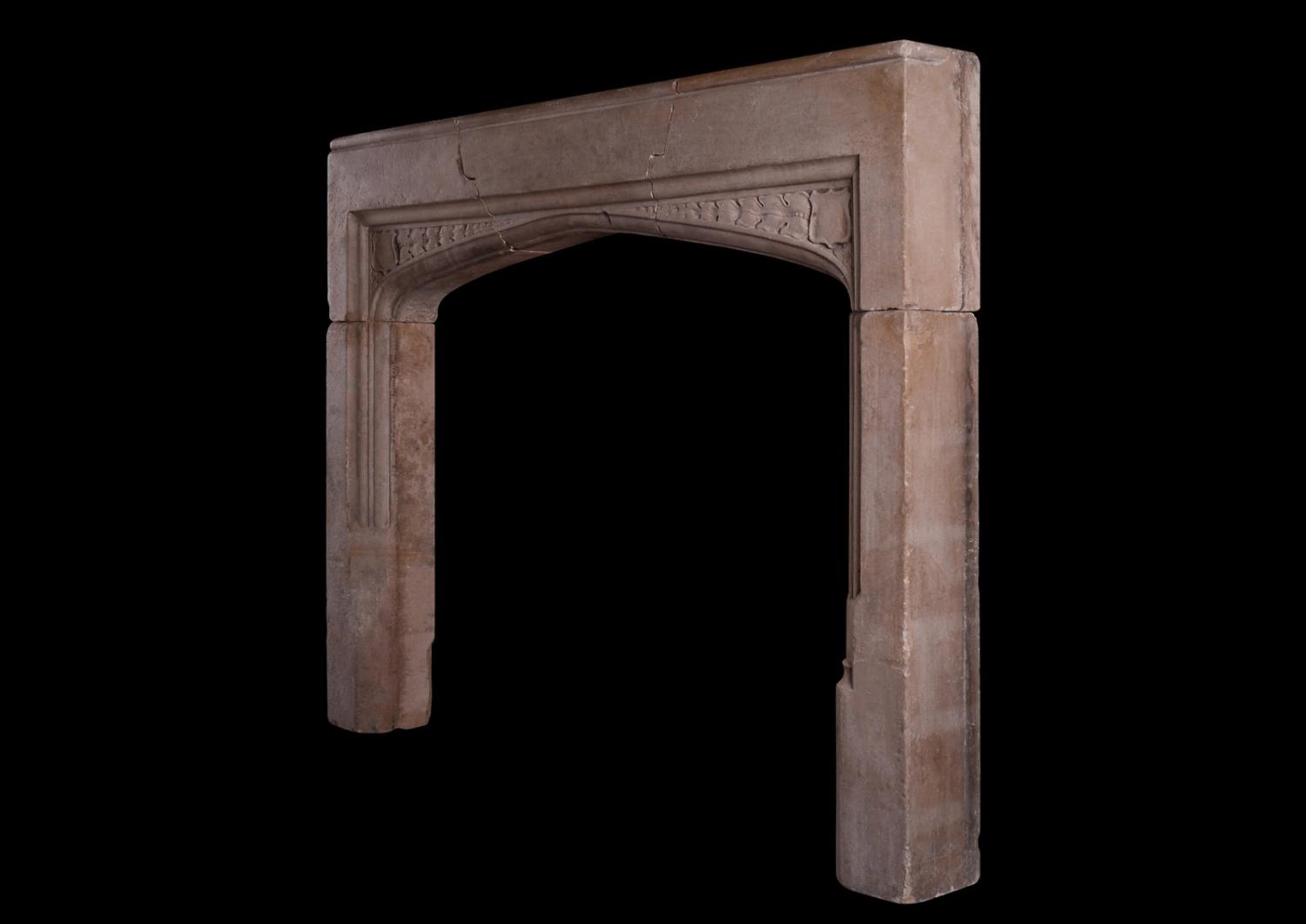 An English moulded stone fireplace in the Gothic manner. The moulded jambs surmounted by arched frieze with carved spandrels featuring leaves and shields. NB. Not currently over-restored to maintain antique charm, however could be restored further if required. 19th century. Provenance: Originally from The Dorchester Hotel, London.