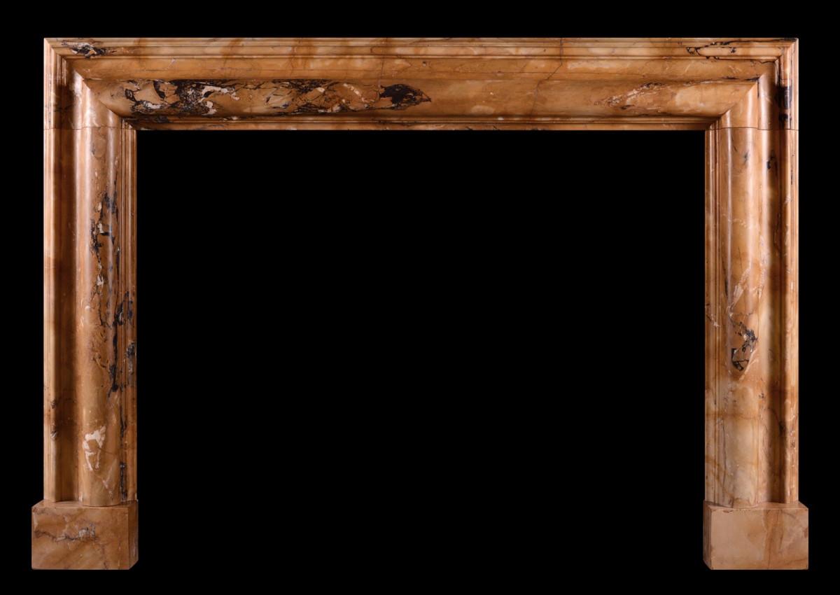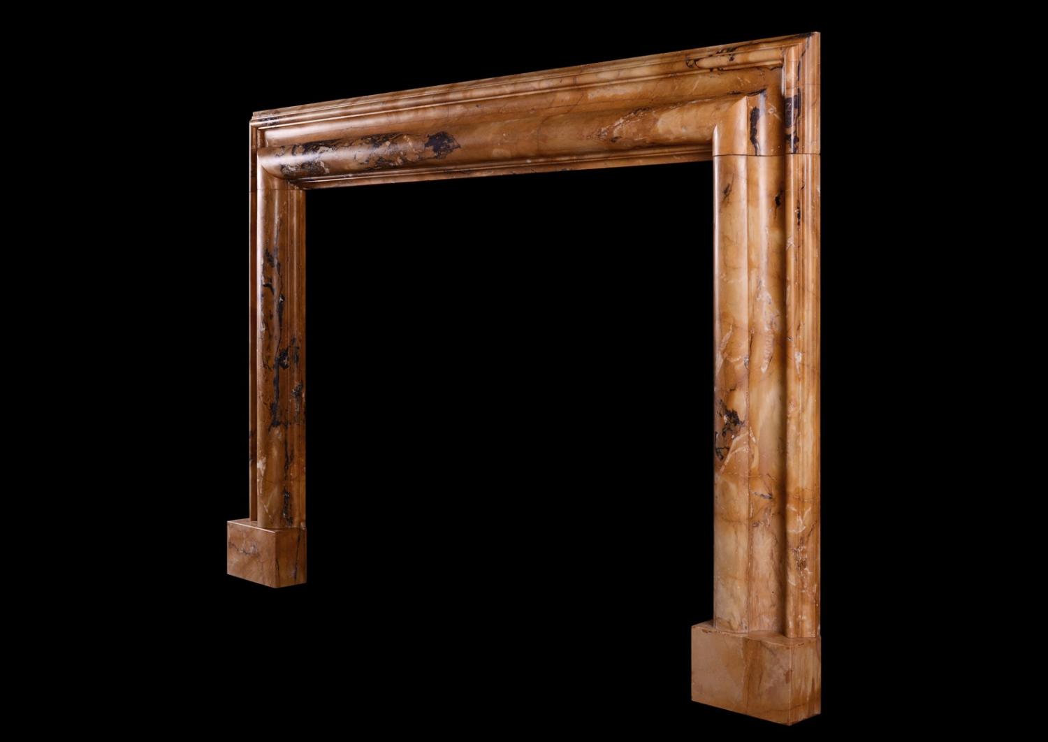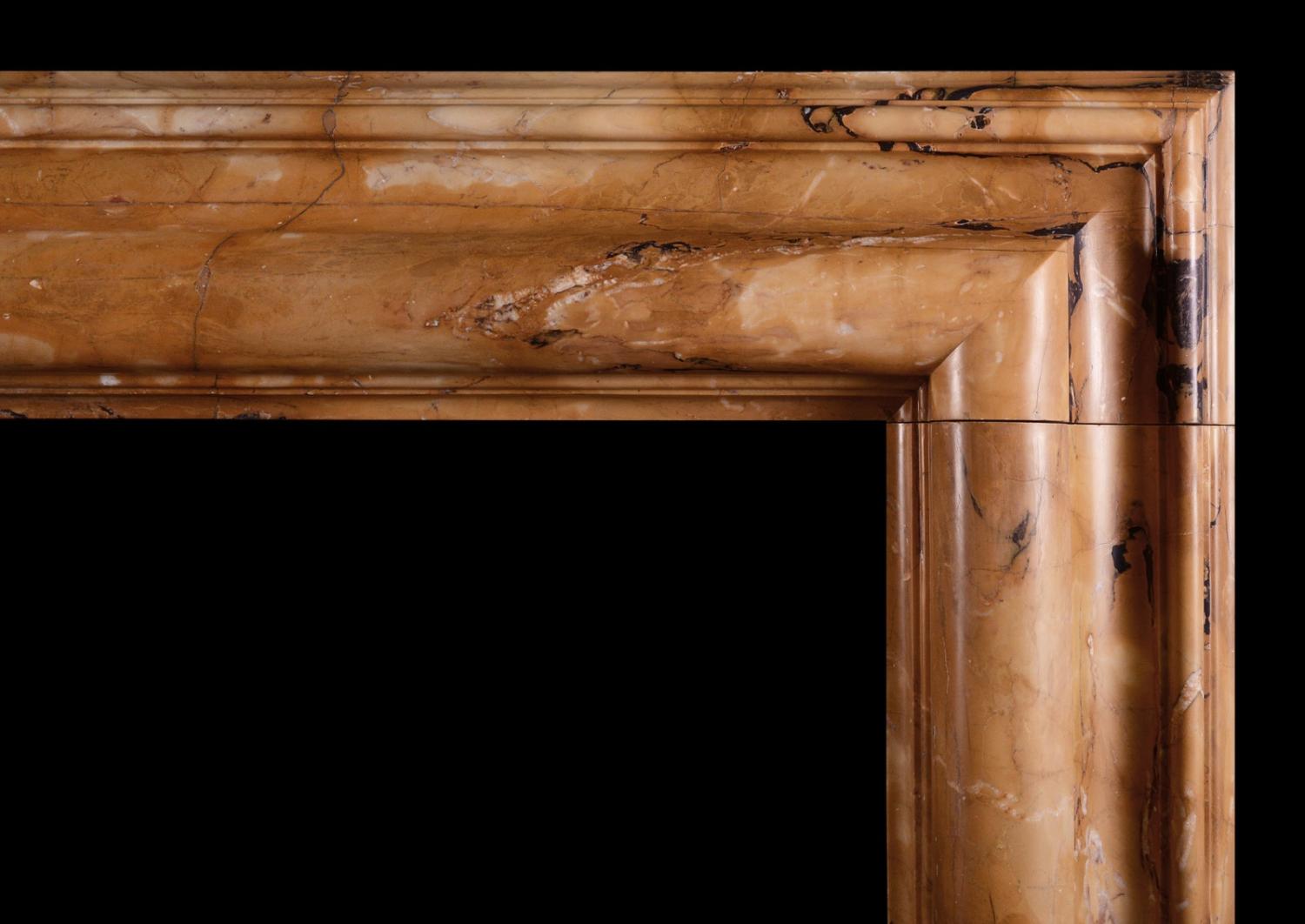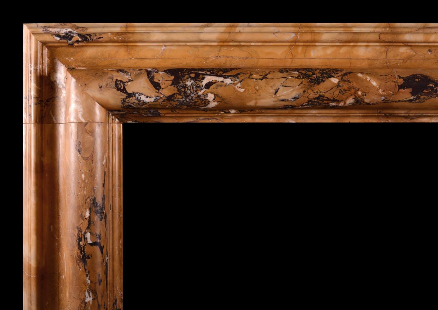 A very fine quality Italian Siena marble bolection fireplace. Italian Siena marble is prized for its rich golden-honey tones, warm veining, and unmistakably luxurious character, quarried in limited quantities from the hills around Siena in Tuscany. Its rarity, combined with centuries of use in important palazzi, churches, and Renaissance interiors, has made it a symbol of refinement and character. English, late 18th /early 19th century.