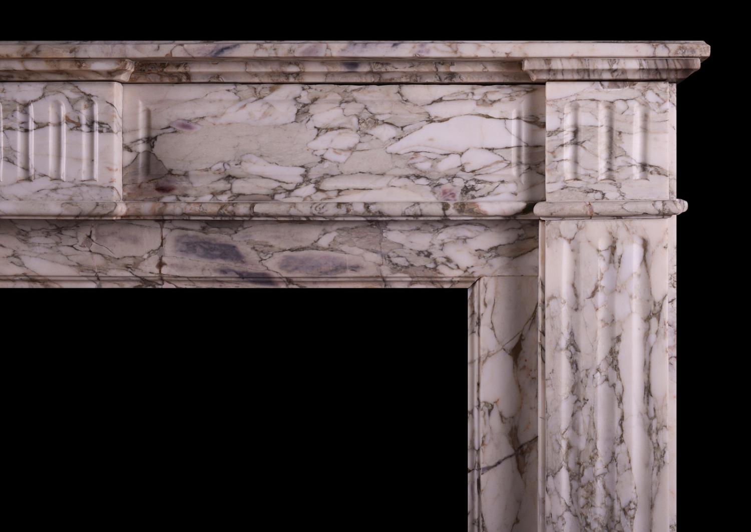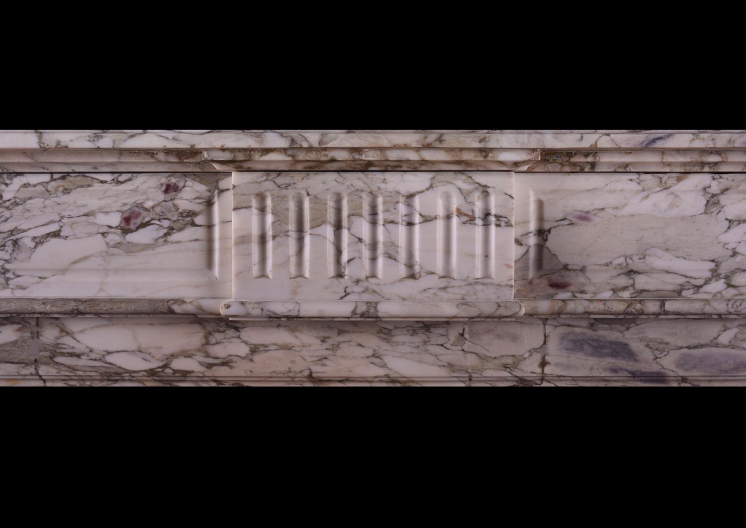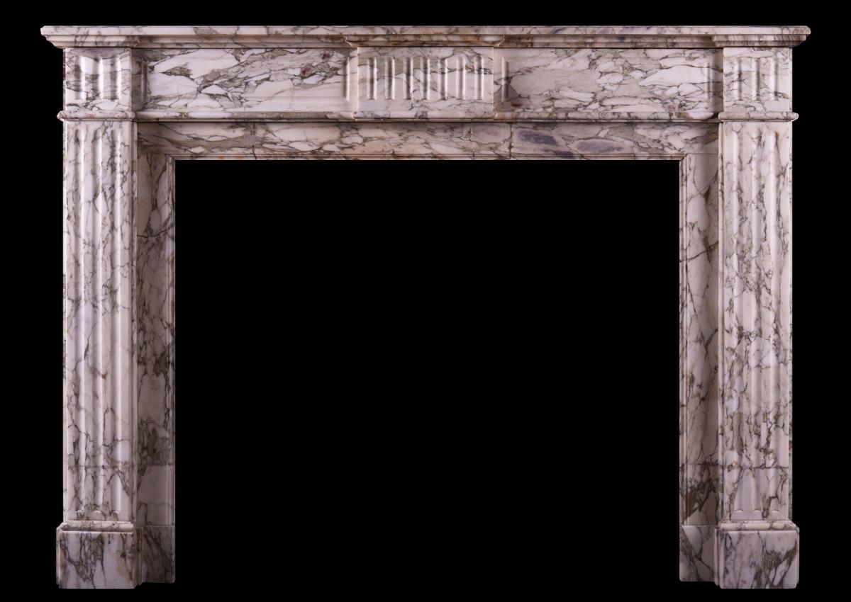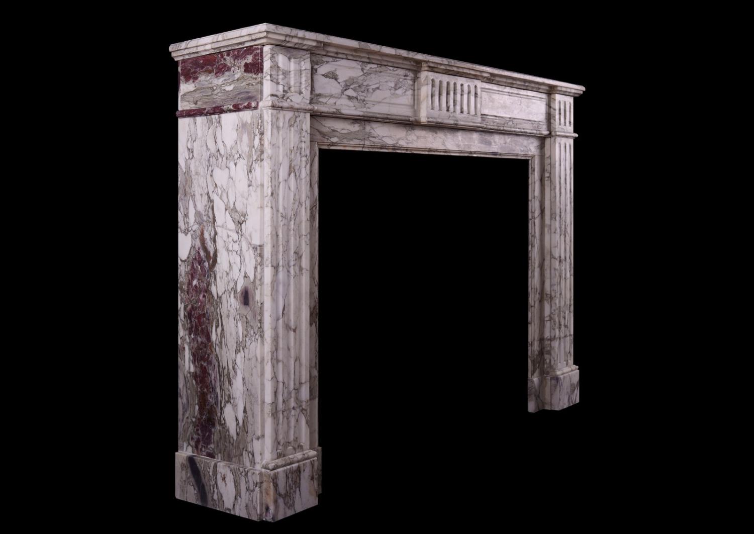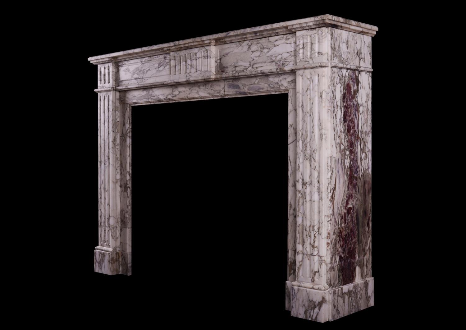 A French Louis XVI style fireplace in Breccia di Seravezza. The fluted jambs surmounted by panelled frieze with matching fluting to centre block and end blocks. Good quality marble, with hints of greens, greys and purple hues. Mid 19th century.