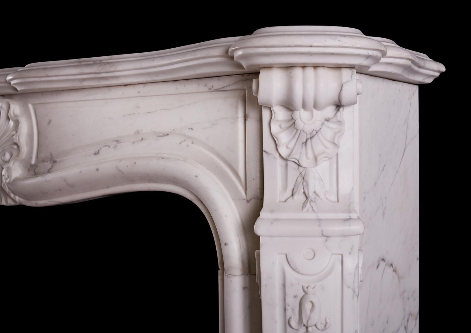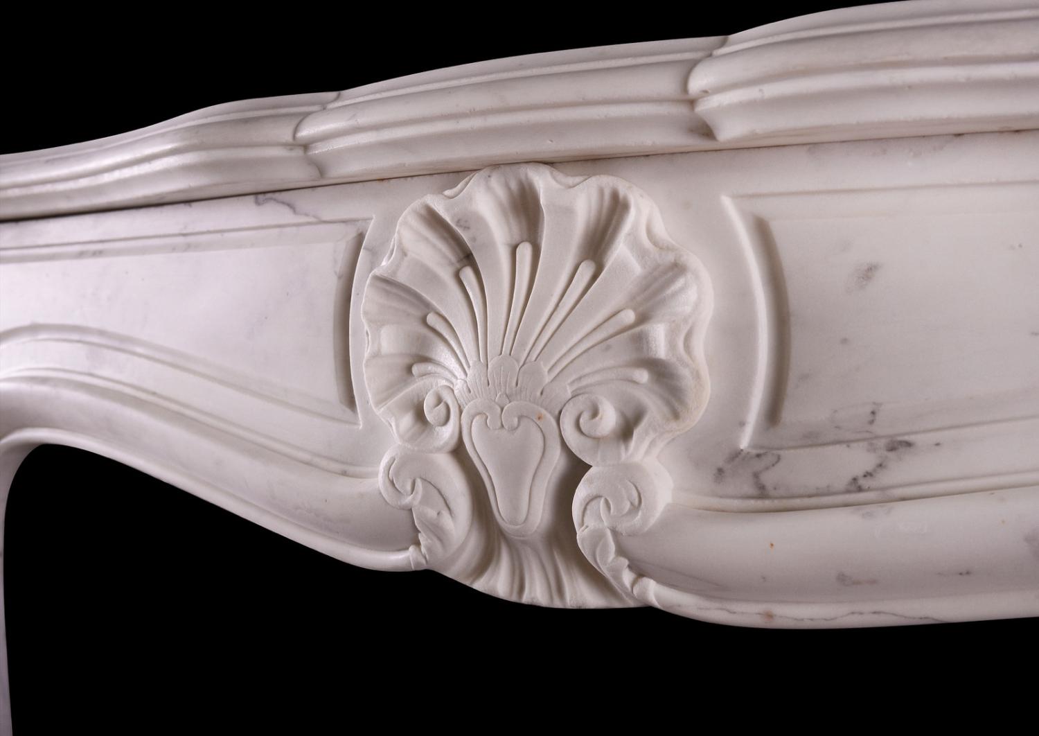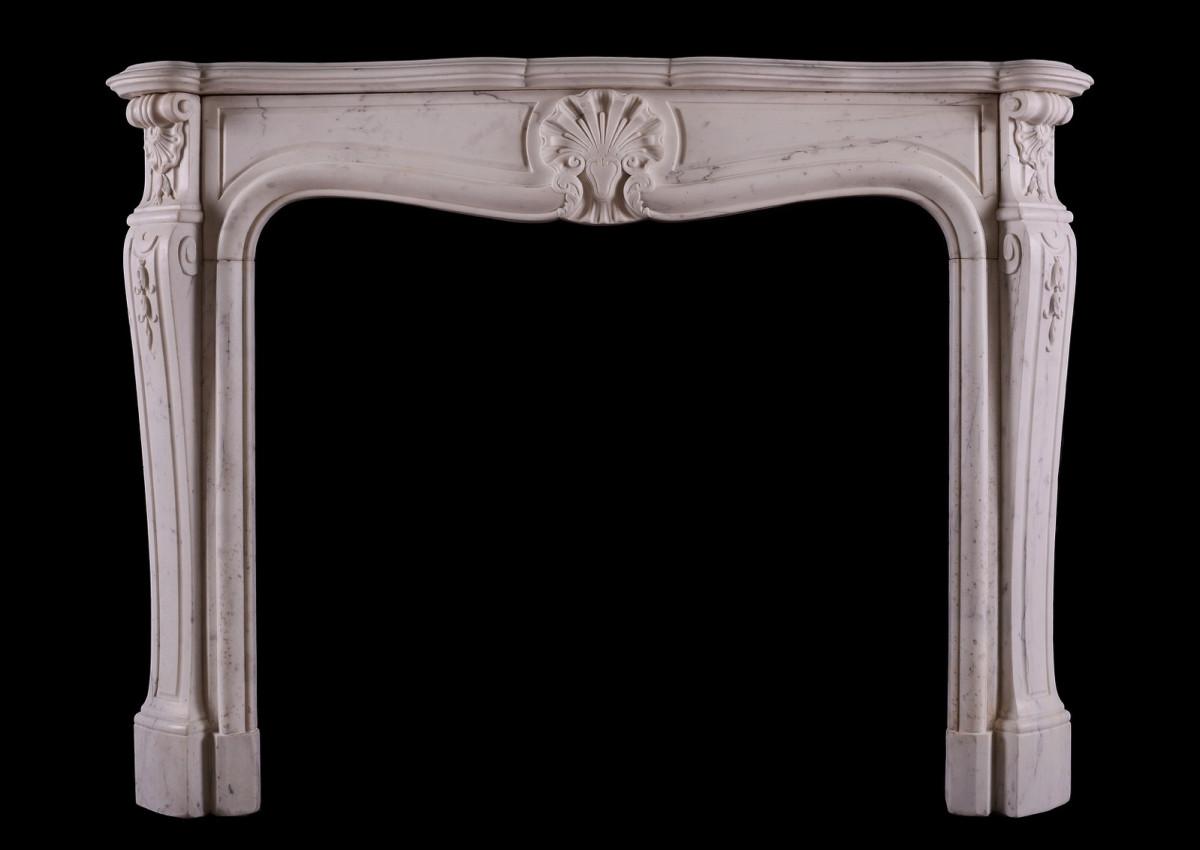 A Louis XV style fireplace in a pencil veined Statuary marble. The panelled jambs with carved bellflowers, with scrolls above. The frieze with central carved shell flanked by shaped panels, with shaped, moulded shelf above. French, 19th century.