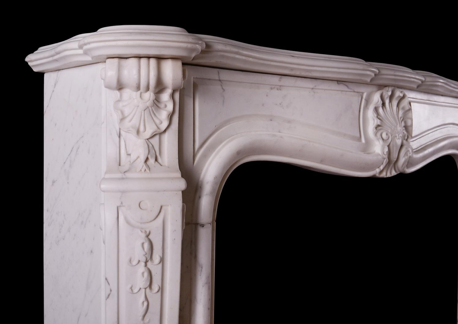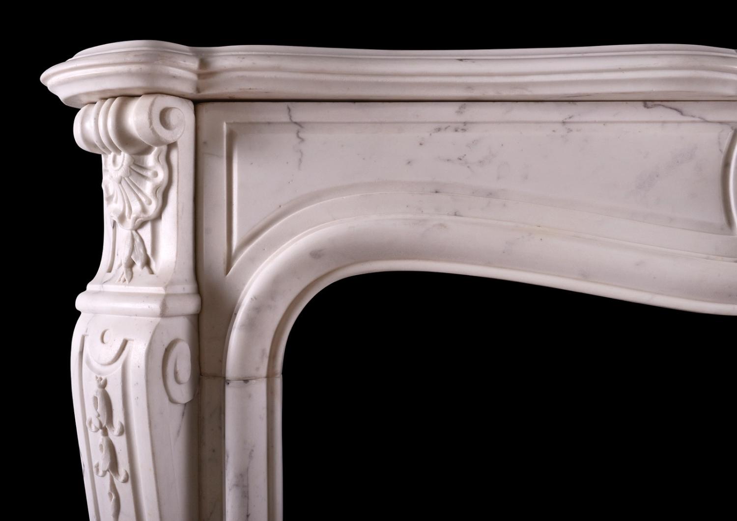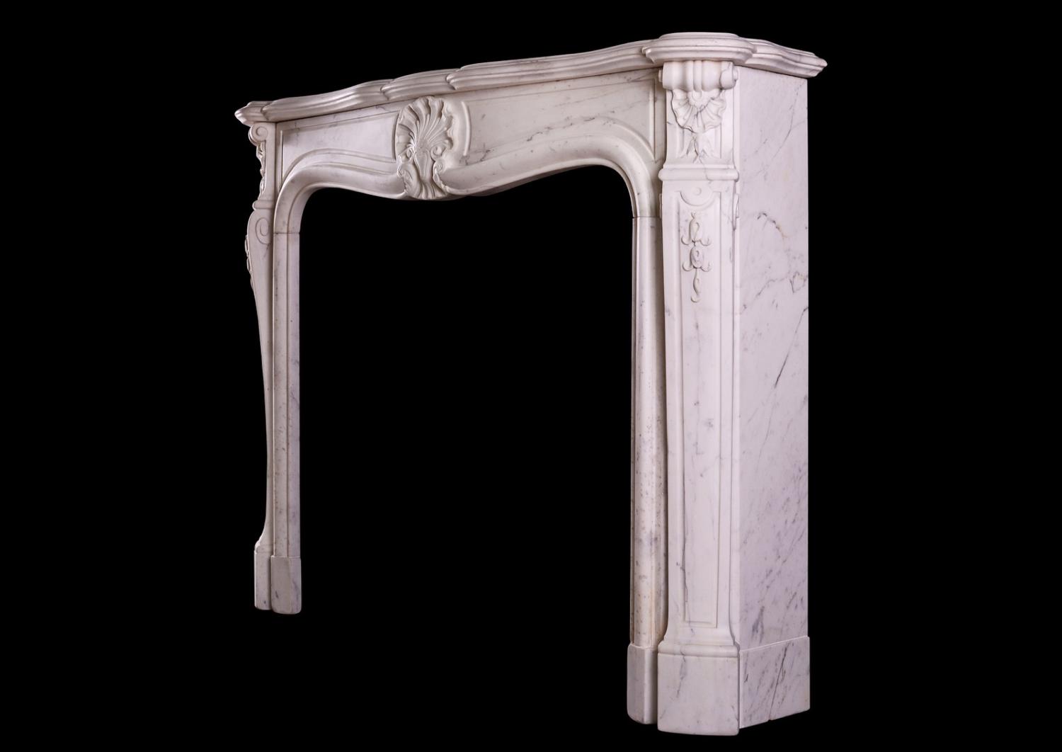 A Louis XV style fireplace in a pencil veined Statuary marble. The panelled jambs with carved bellflowers, with scrolls above. The frieze with central carved shell flanked by shaped panels, with shaped, moulded shelf above. French, 19th century.