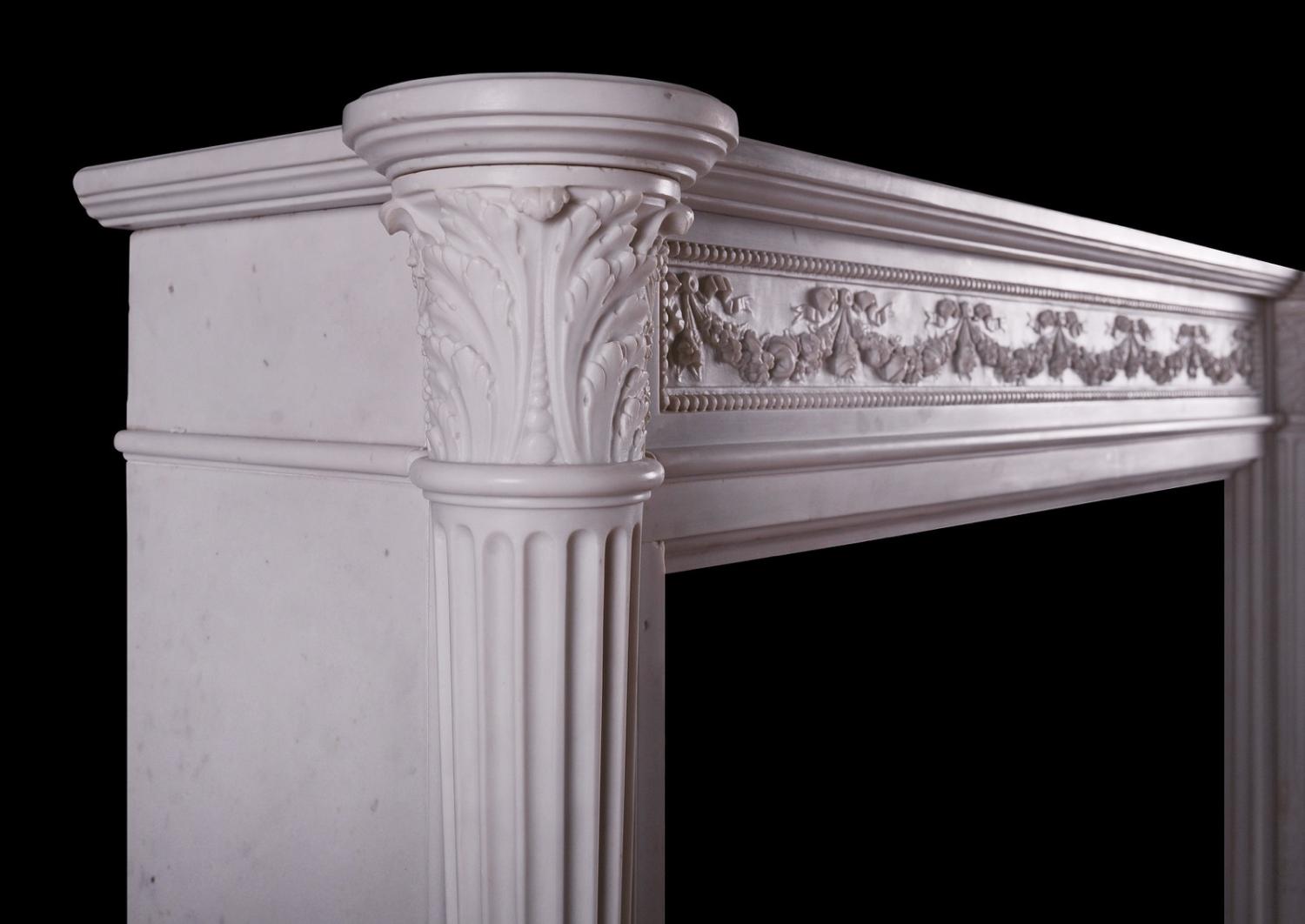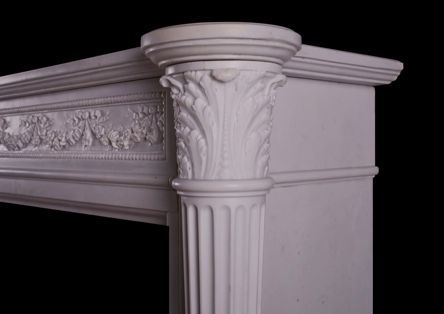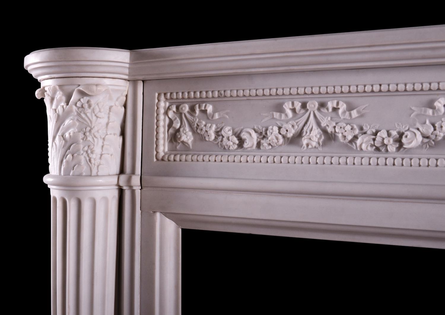 A fine quality French Louis XVI style fireplace in Statuary white marble. The tapering coloumns inlaid with flutes and carved husks, surmounted by carved acanthus leaves. The frieze carved with flowers and drapery throughout, framed by fine beading to panel. Shaped moulded shelf above. French, 19th century.
