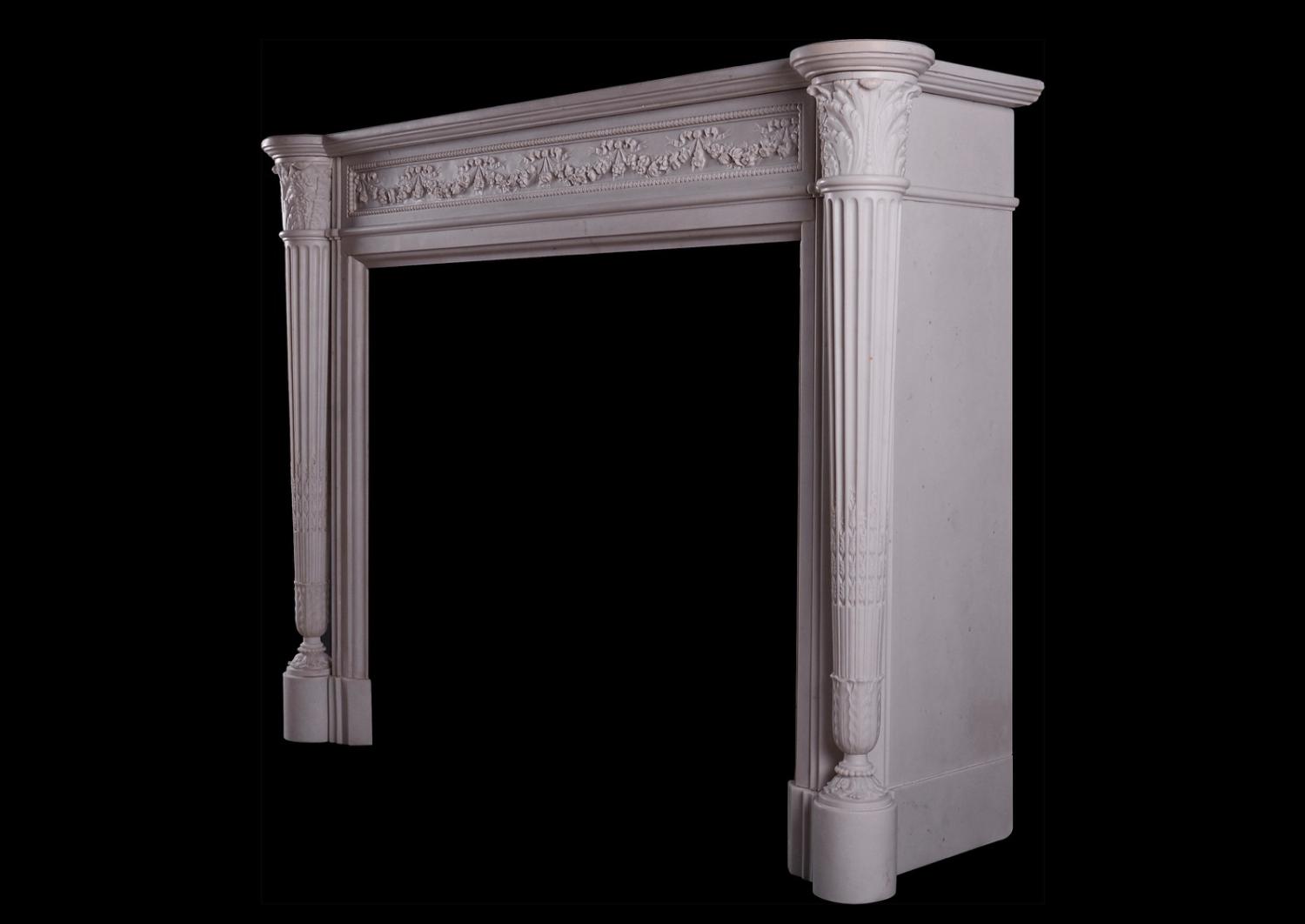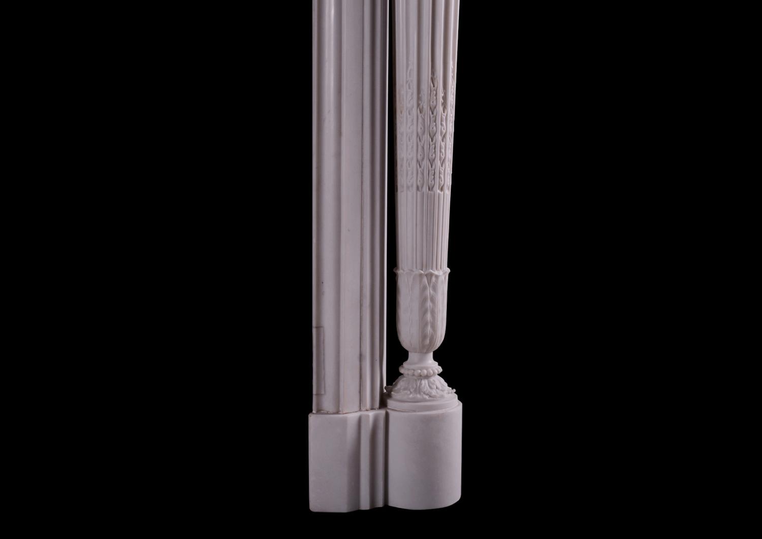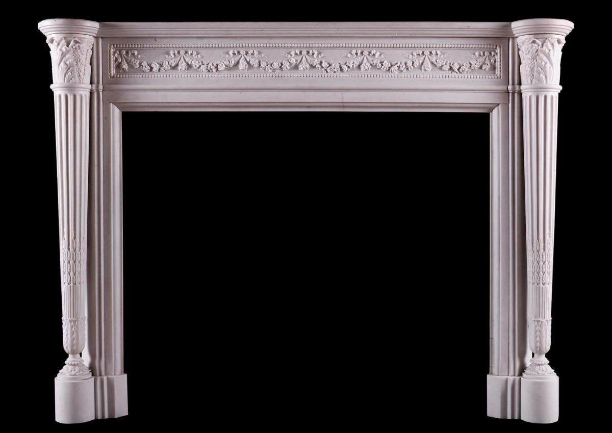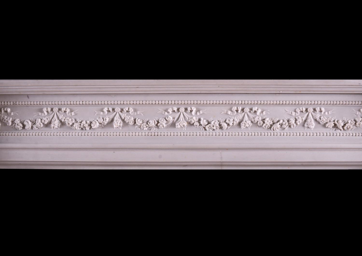 A fine quality French Louis XVI style fireplace in Statuary white marble. The tapering coloumns inlaid with flutes and carved husks, surmounted by carved acanthus leaves. The frieze carved with flowers and drapery throughout, framed by fine beading to panel. Shaped moulded shelf above. French, 19th century.