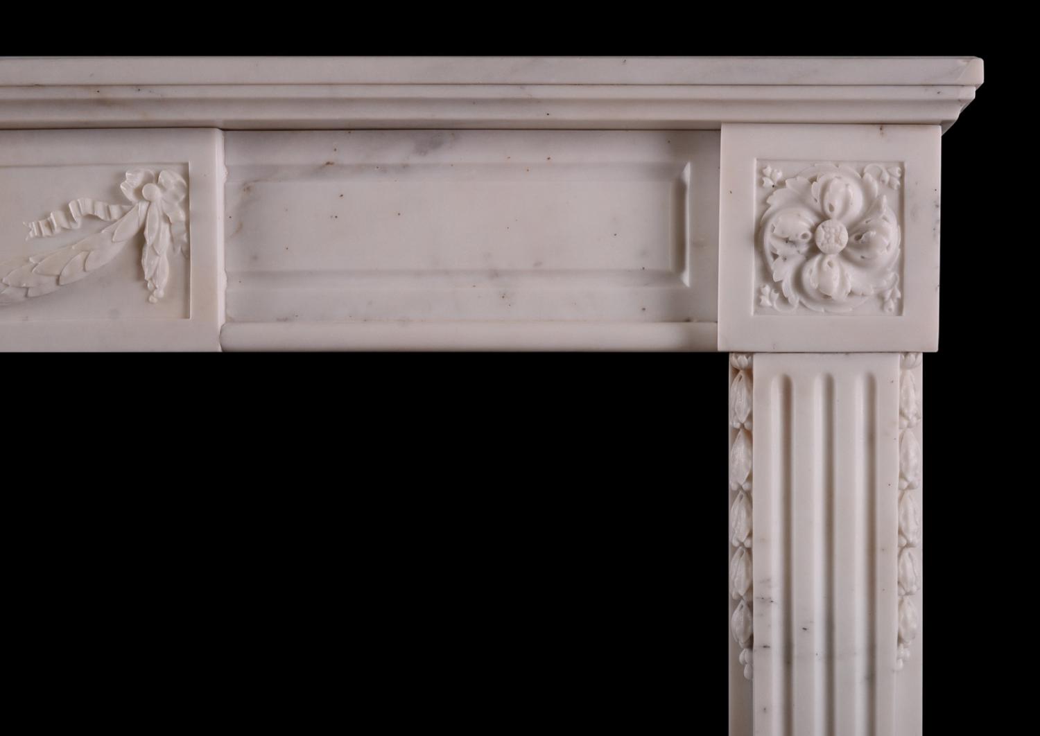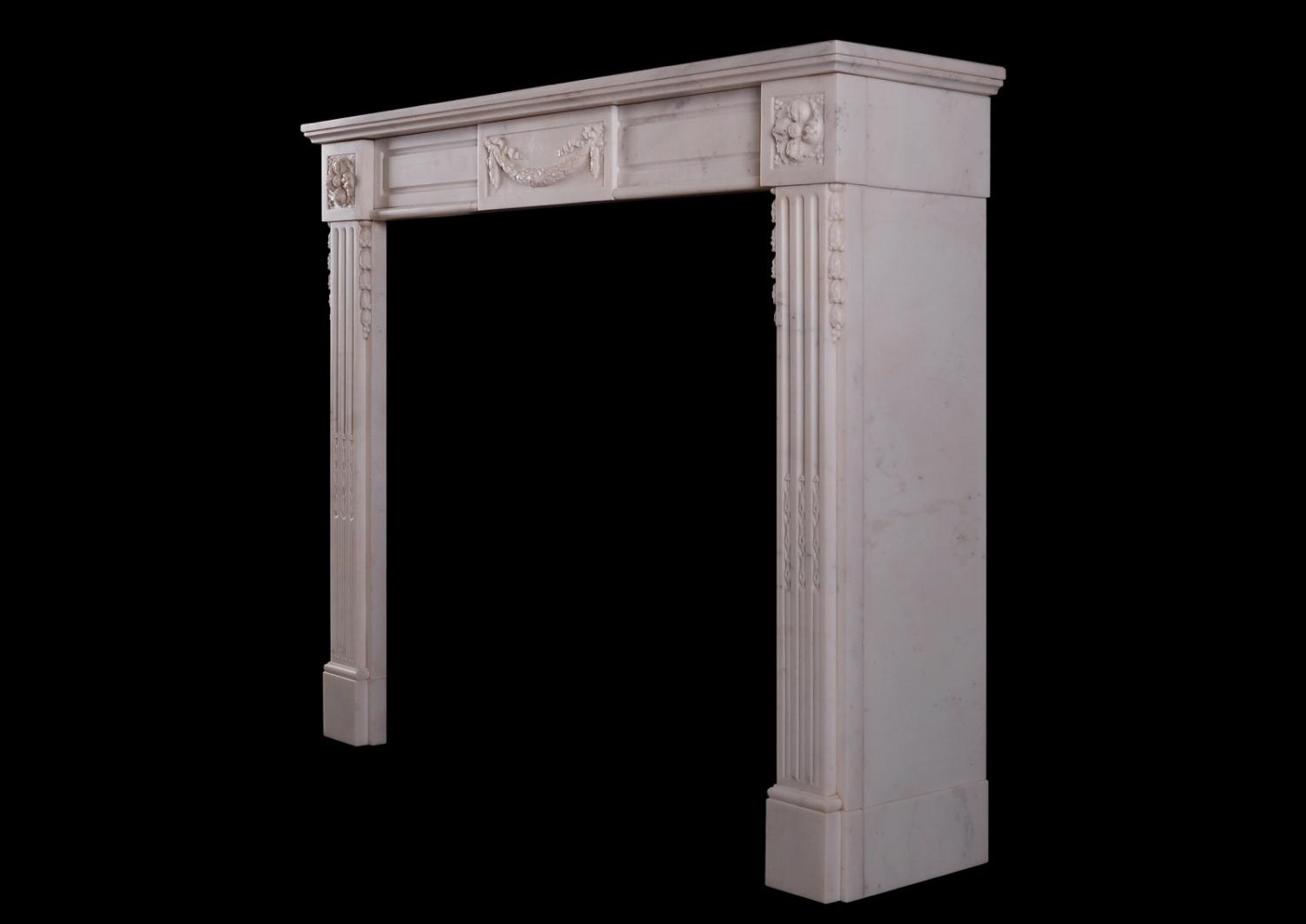 A finely proportioned, petite English Regency statuary marble fireplace in the neoclassical taste, with fluted jambs with vertical anthemion-style drops and carved side blocks enriched with floral paterae. The panelled frieze centred by a draped garland.