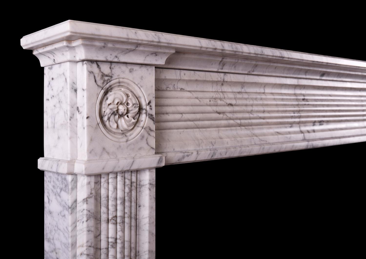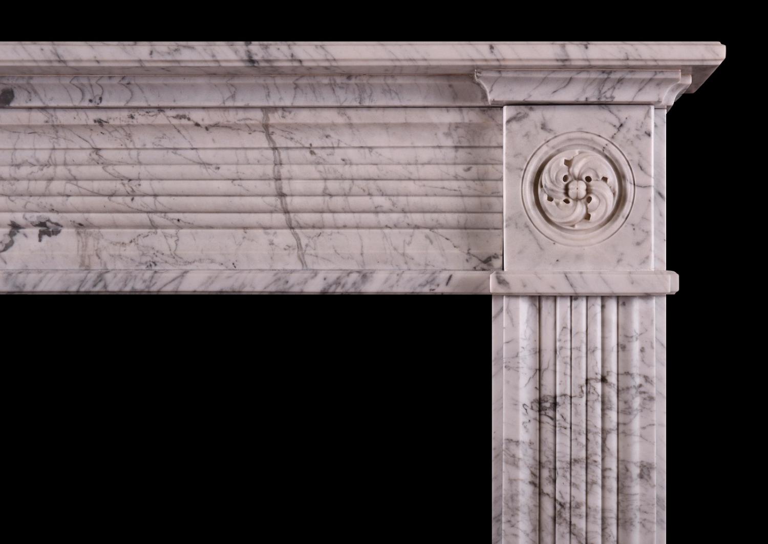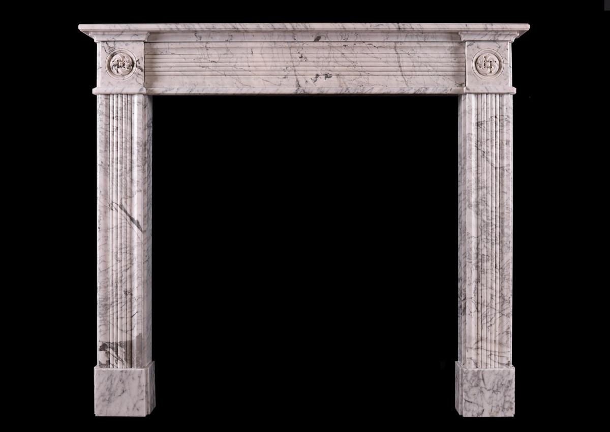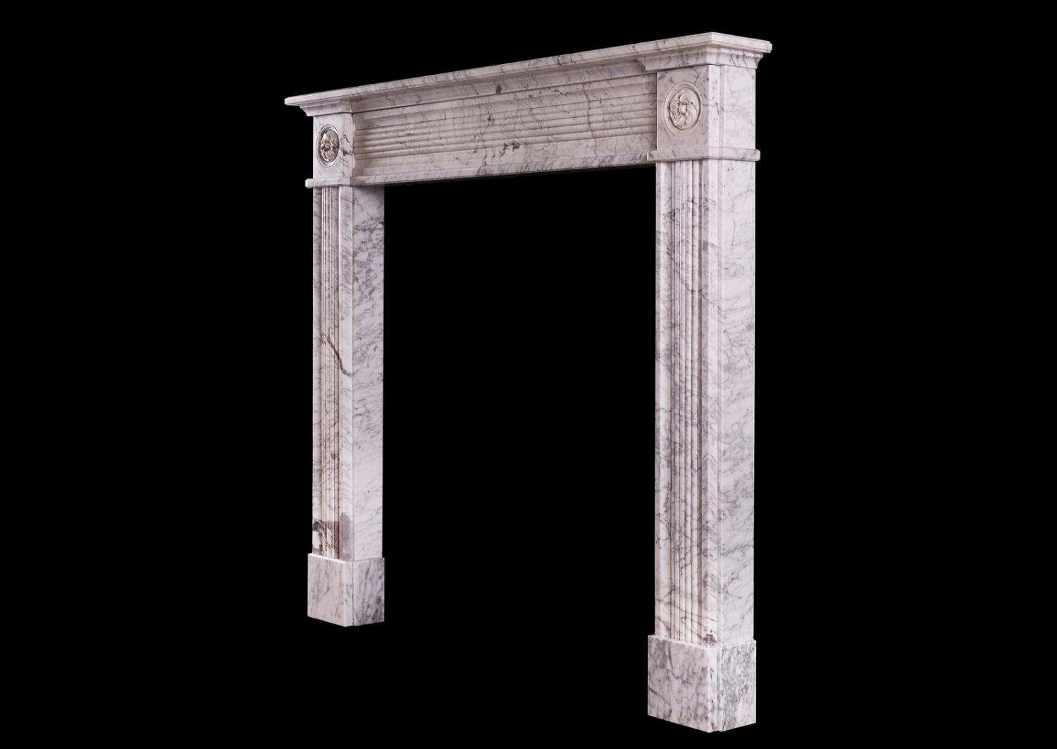 A well proportioned period Regency fireplace in delicately veined Italian Carrara marble. The reeded jambs rise to a conforming reeded frieze, terminating in square end blockings carved with crisply defined rosette paterae. The frieze surmounted by a well-moulded shelf with subtle stepped detailing, giving the piece a refined architectural presence. The elegant carving and restrained classical ornament are characteristic of the Regency taste for balanced proportions; well suited for a Study or smaller Drawing Room. English, early 19th century.