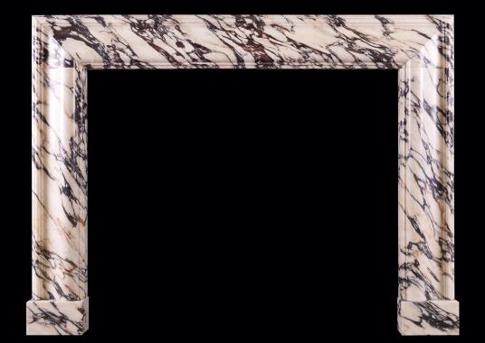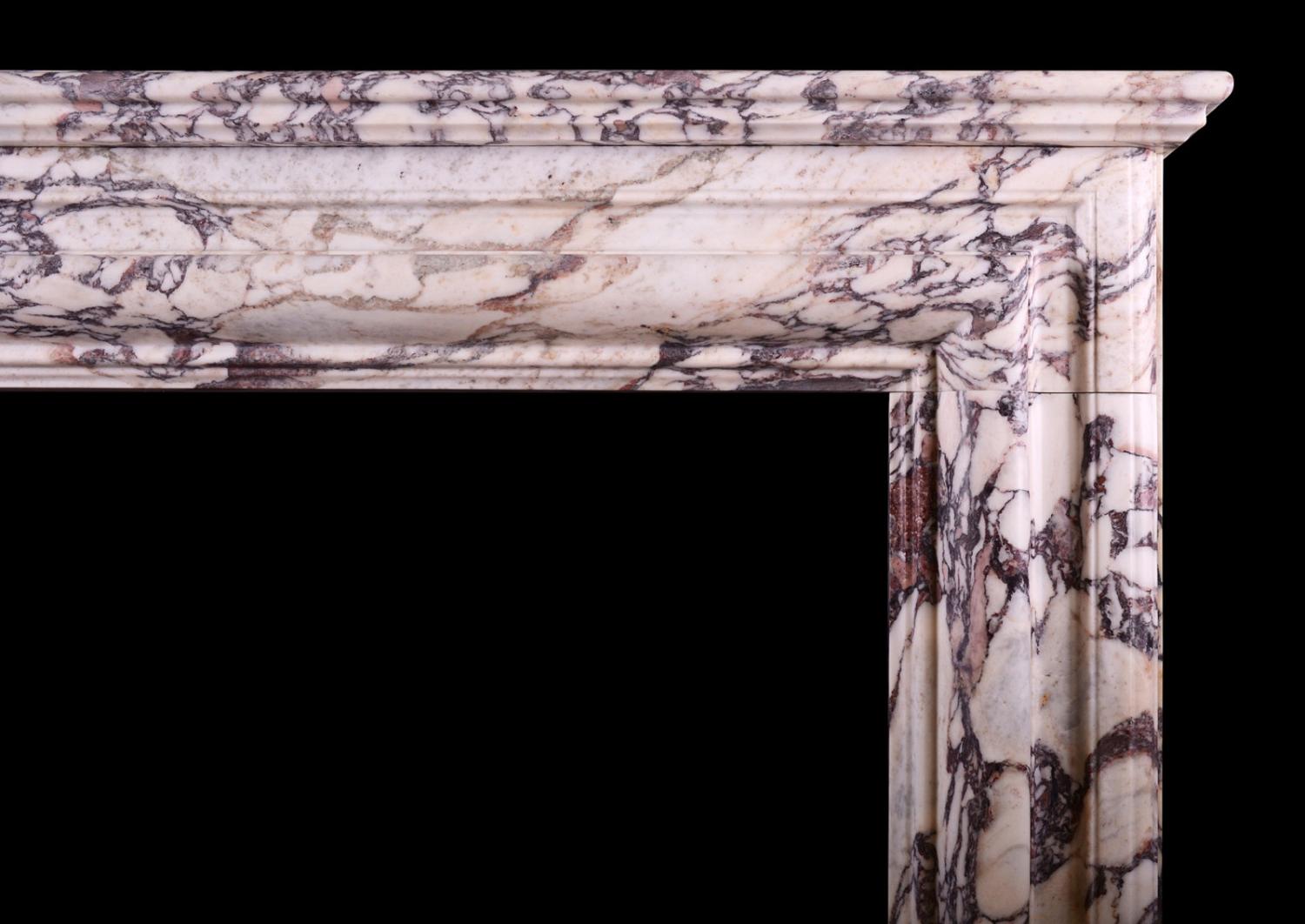 An architectural English fireplace in Breche Violette marble. The jambs and frieze with bolection moulding throughout, surmounted by moulded shelf. Unusually deep design for the style adding the benefit of a mantel. Modern. N.B. May be subject to an extended lead time, please enquire for more information.