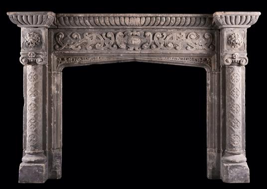 A French Louis XIII style Ancaster stone fireplace, with heavy architectural inner moulding, with shaped scalloped frieze, surmounted by moulded shelf in three pieces. A rustic piece. N.B. May be subject to an extended lead time, please enquire for more information.