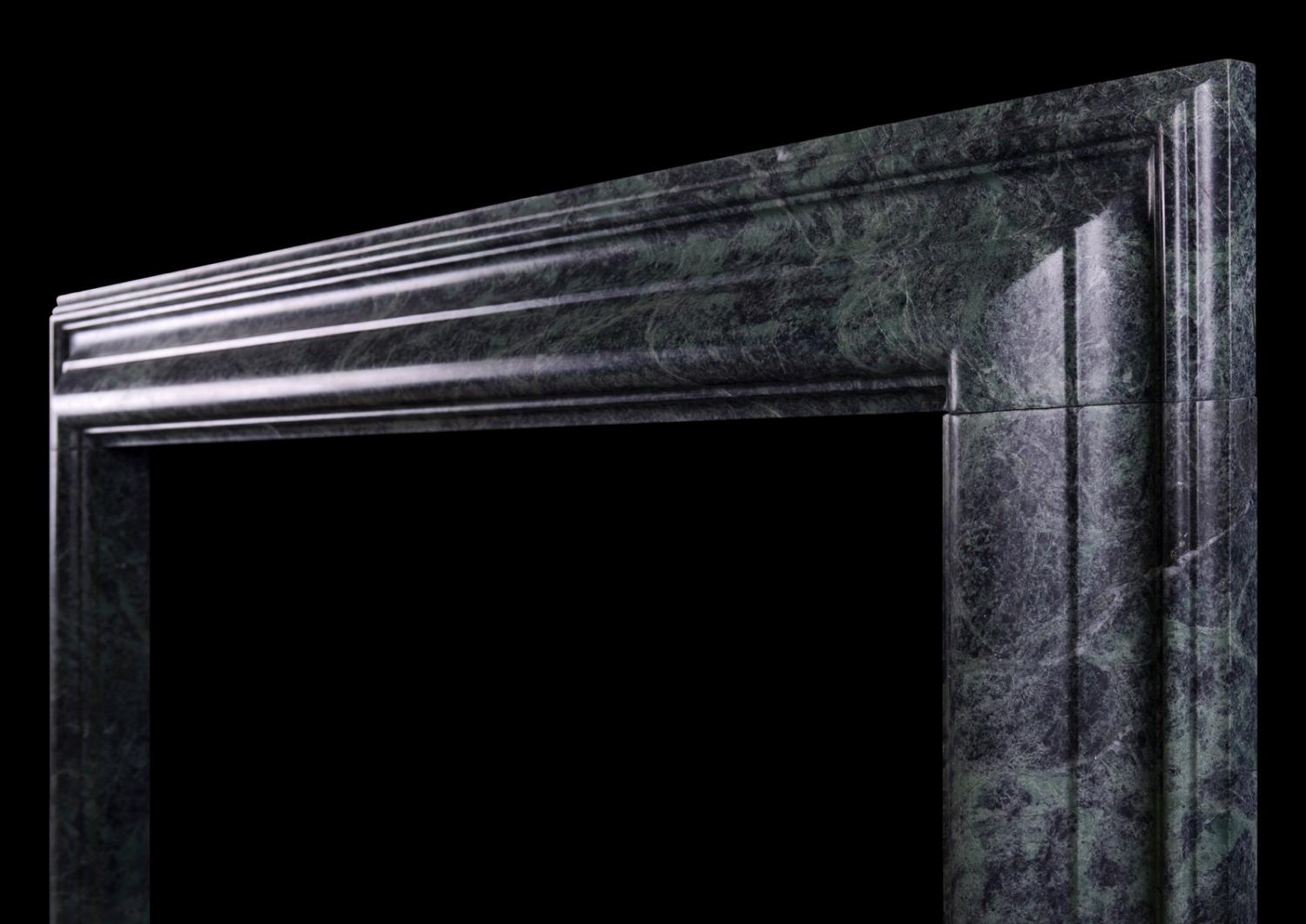 An English moulded bolection fireplace in Emerald Antico dark green marble. Based on a period original. An elegant shape with matched moulded plinth blocks. Modern. N.B. May be subject to an extended lead time, please enquire for more information.