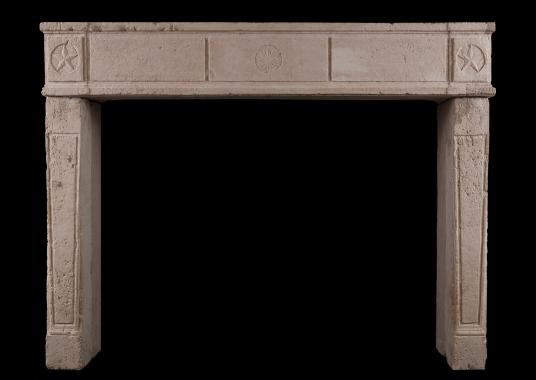 A simple French fireplace in rustic Travertine stone. The shaped jambs surmounted by plain frieze and moulded shelf above. Modern.