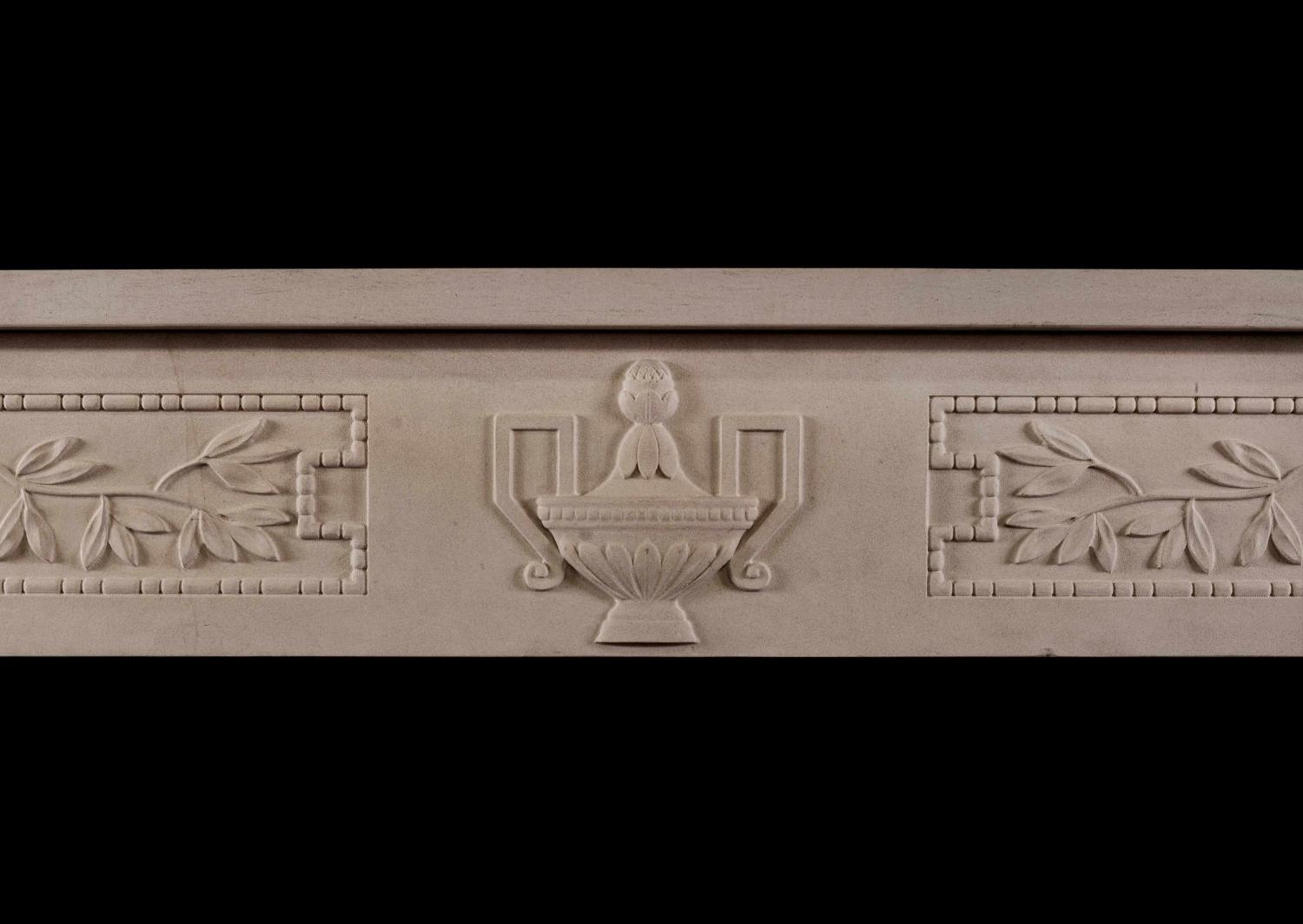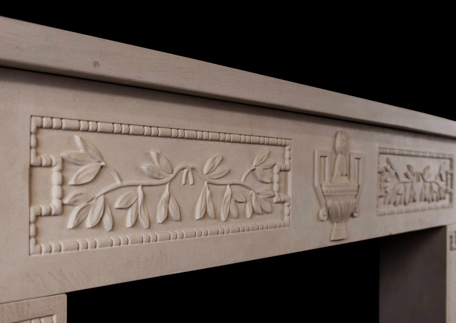 A rustic and imposing limestone fireplace in the French Louis XVI style. The frieze with carved centre urn and beaded side panels with foliage decoration. The carved, panelled jambs with matching beading to frieze. A copy of an 18th century original. Could be antiqued if required. N.B. May be subject to an extended lead time, please enquire for more information.