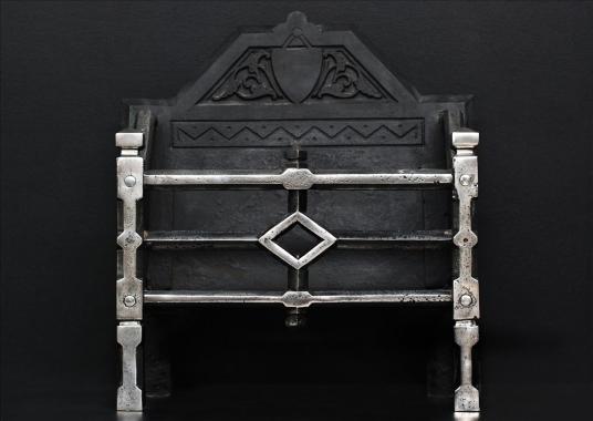 A good quality brass and steel firegrate in the Georgian manner. The tapering brass legs surmounted by classical urn finials. The pierced, beaded fret engraved with mythical beasts and urns. The burning area with bowed steel front bars, flanked by engraved sidewings. Plain iron back plate to rear. English, 19th century.