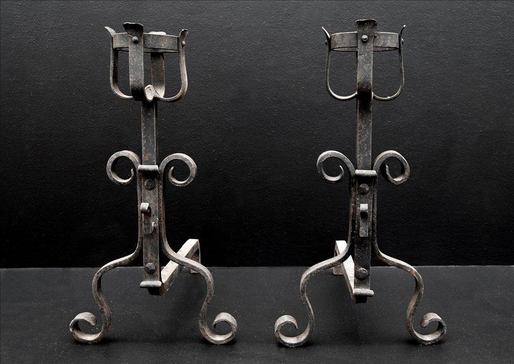 A pair of weighty 20th century wrought iron firedogs of scrolled design to feet and shaft surmounted by mulling tops.