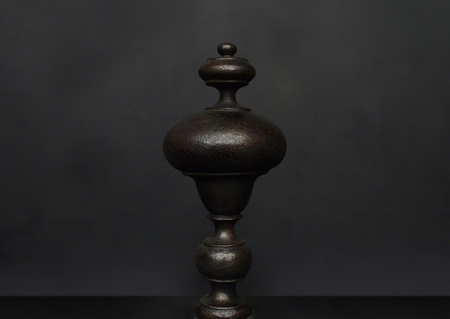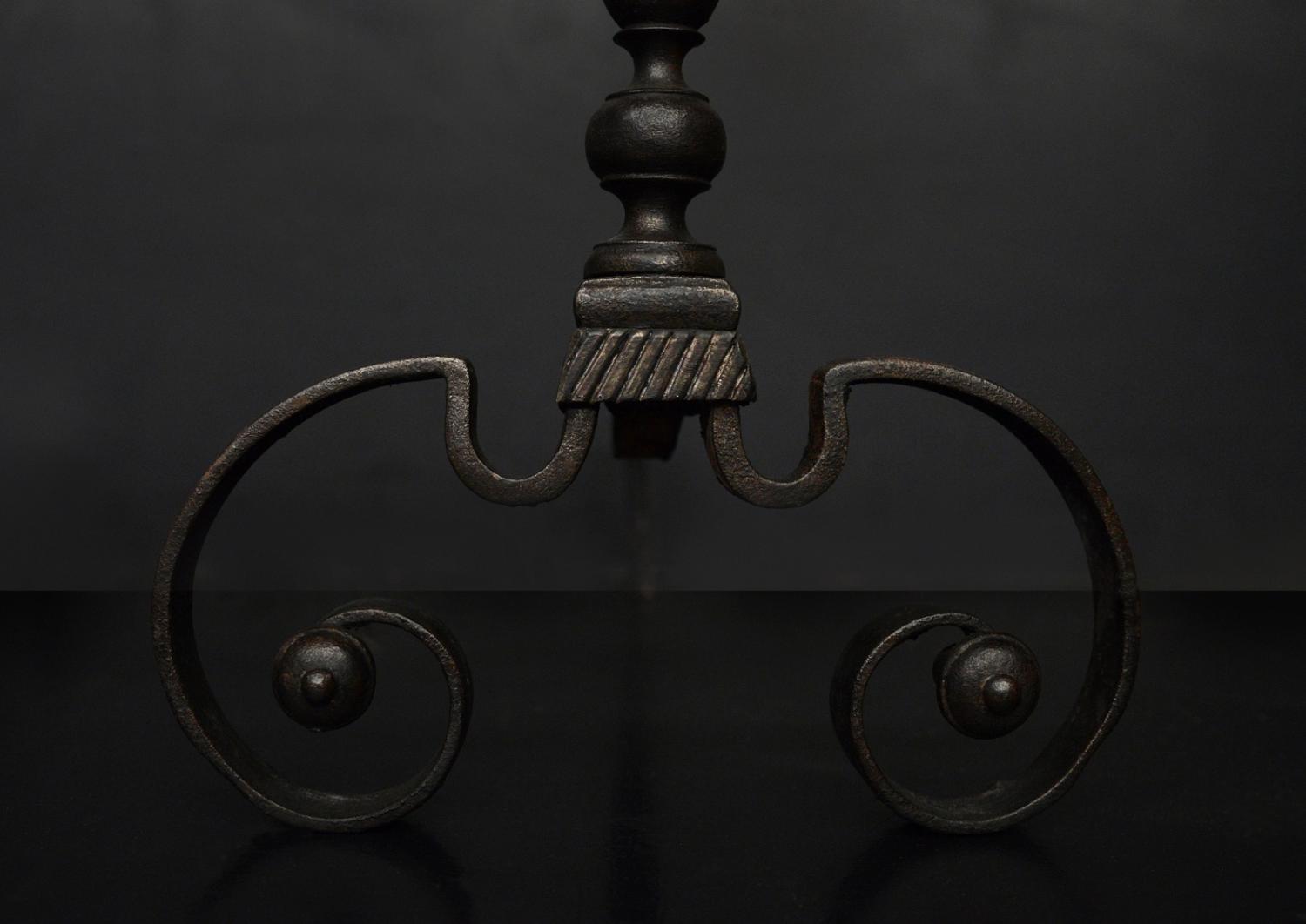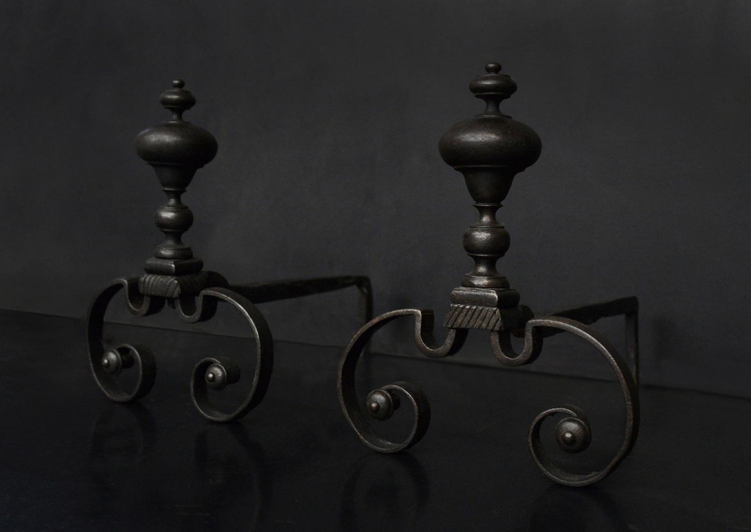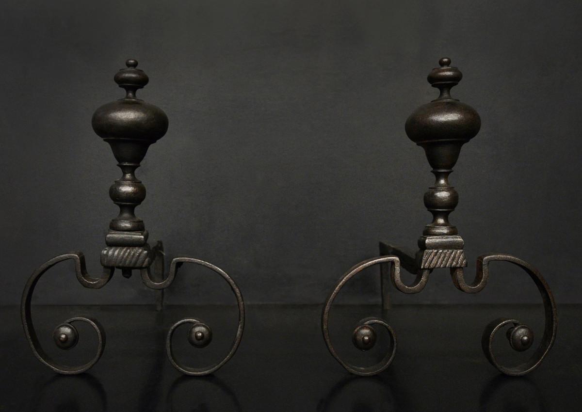 An attractive pair of English firedogs with a dark wax finish. The scrolled feet surmounted by bulbous finials above. Circa 1900.