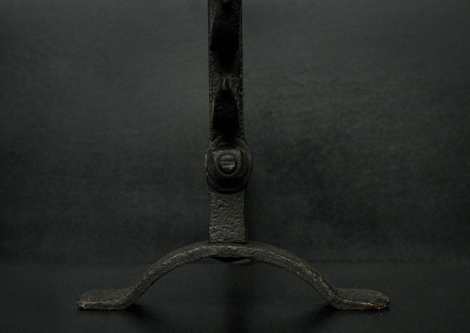 A pair of vintage iron firedogs, hooks to fronts and ball finials. Early 20th century.