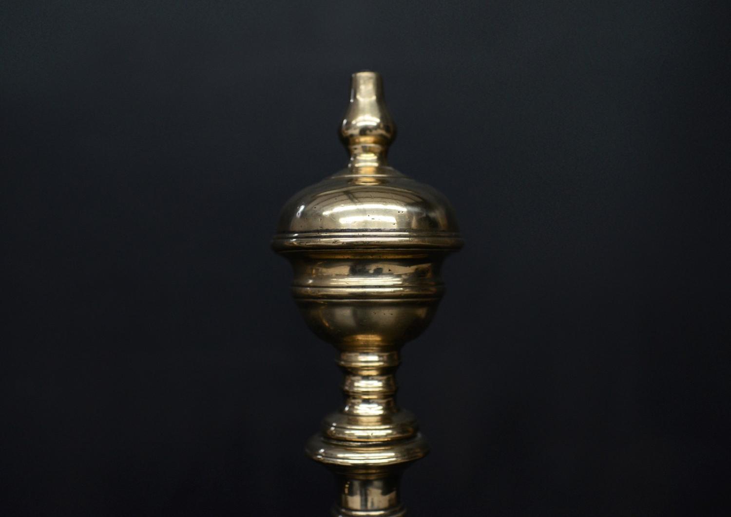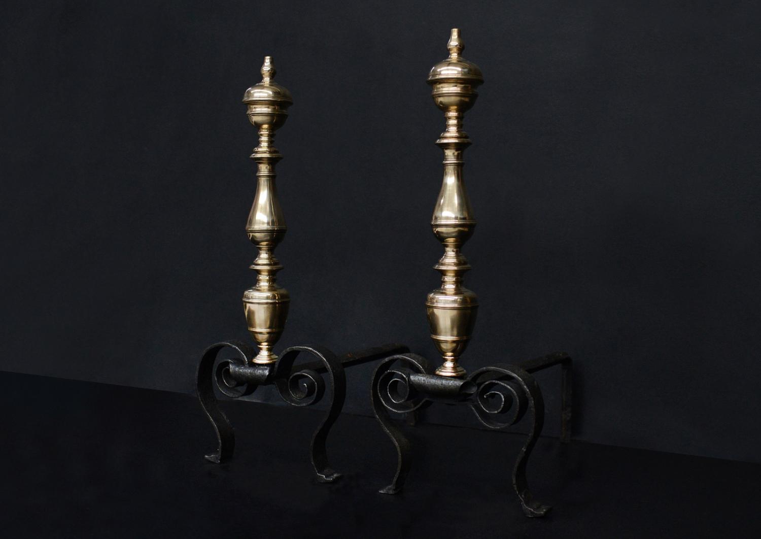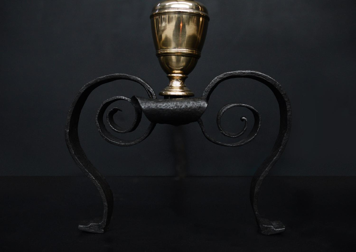 An elegant pair of brass and steel firedogs. The scrolled wrought iron feet surmounted by turned brass uprights with urn tops. English, 19th century.