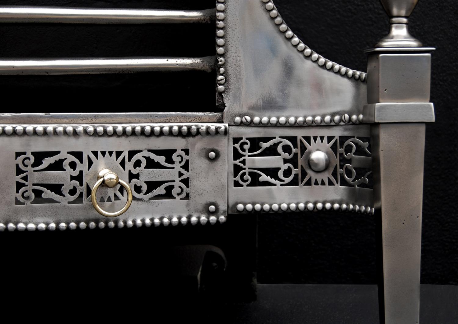 An attractive English George III style steel firegrate. The finely pierced serpentine fretwork of lyre design, tapered legs surmounted by urn finials. Shaped frontbars and square backplate. 19th century.