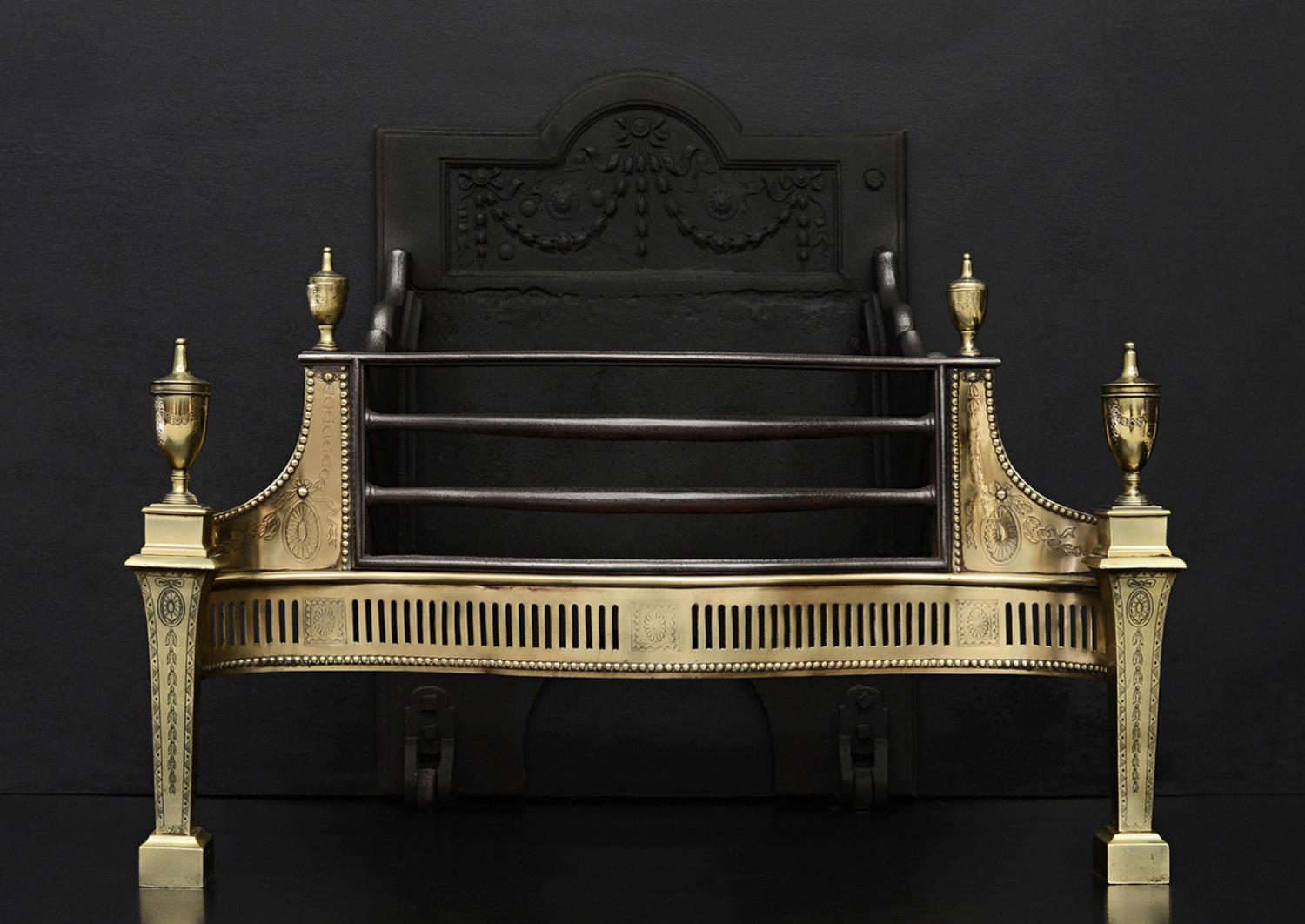A 19th century brass firegrate in the Georgian manner. The tapering legs engraved with bellflowers and paterae, surmounted by urn finials. The fluted and beaded fret surmounted by bowed cast iron front bars, flanked by decorative side wings. Cast iron back behind.