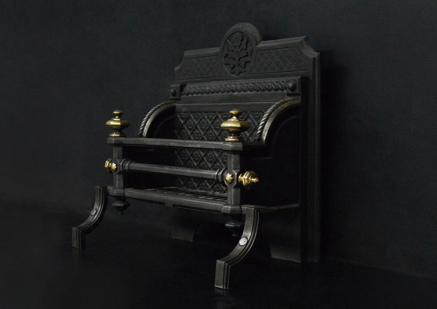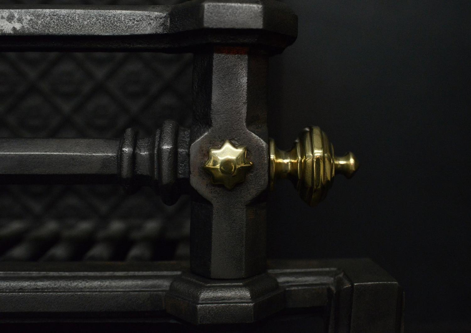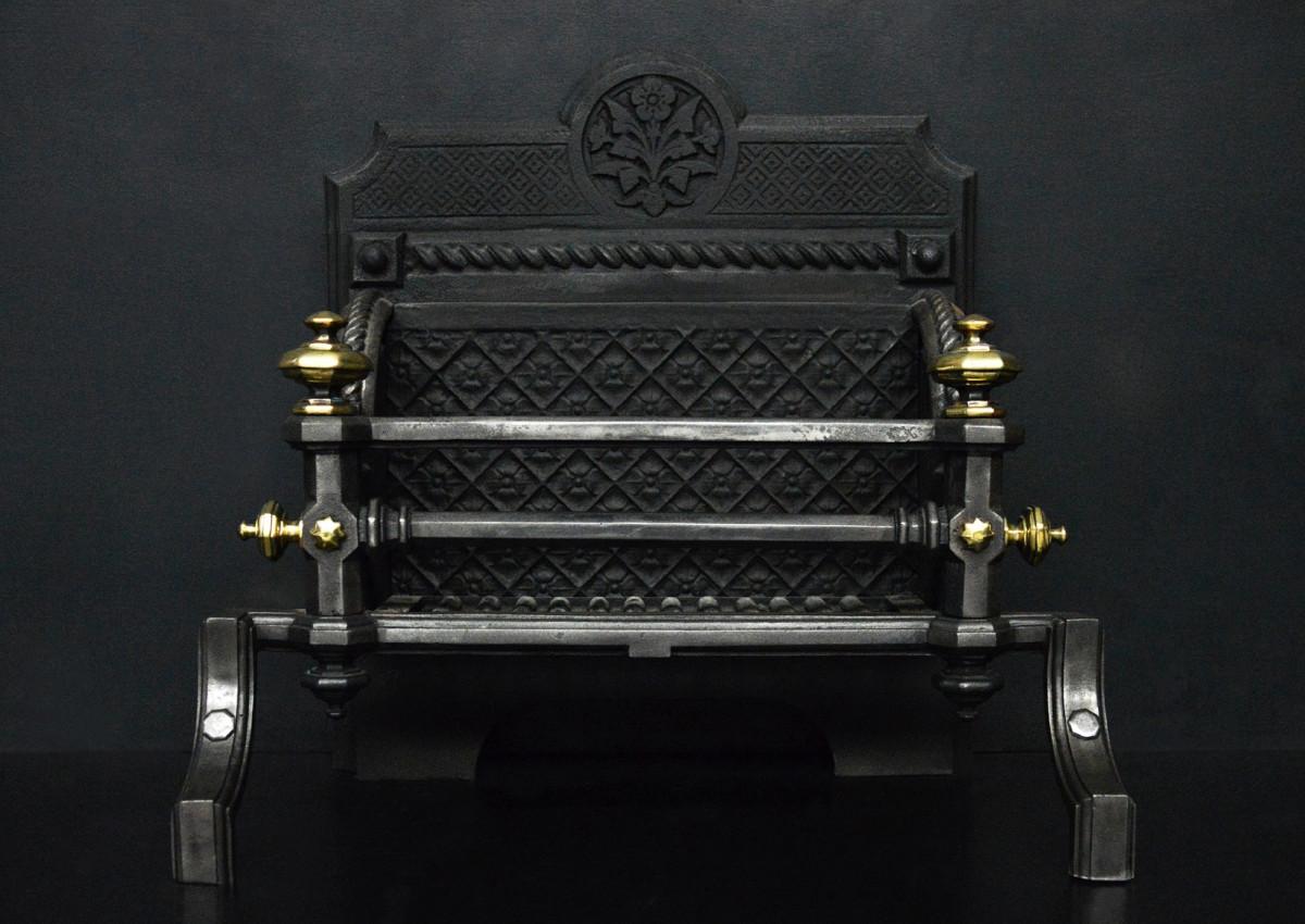 An unusual English firegrate in the Neo-Gothic taste. The shaped feet surmounted by hexagonal uprights with brass finials above. The burning area with rosette backplate with decorative floral motif above. English, Victorian.