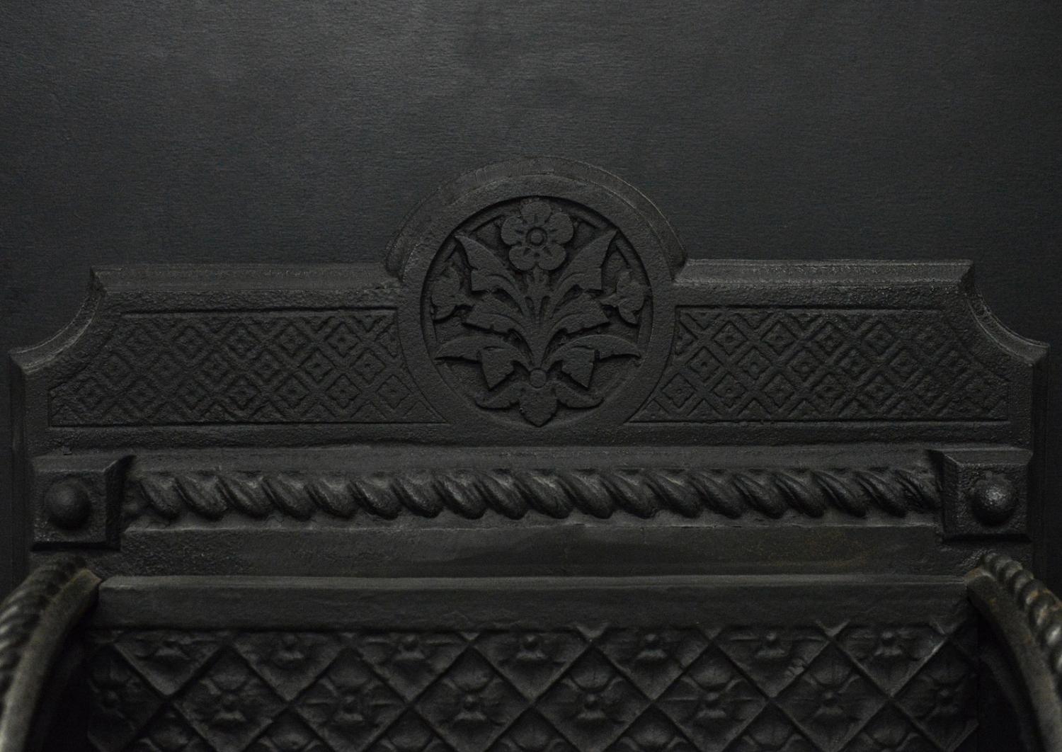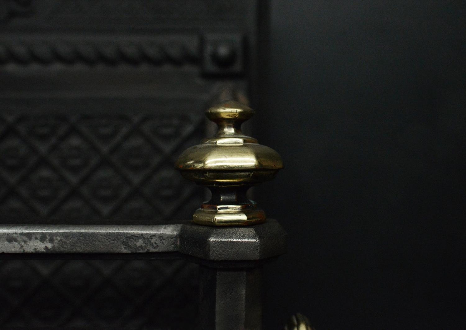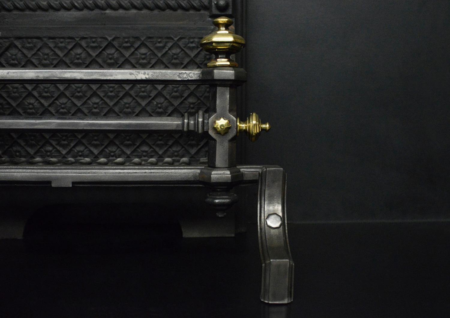 An unusual English firegrate in the Neo-Gothic taste. The shaped feet surmounted by hexagonal uprights with brass finials above. The burning area with rosette backplate with decorative floral motif above. English, Victorian.
