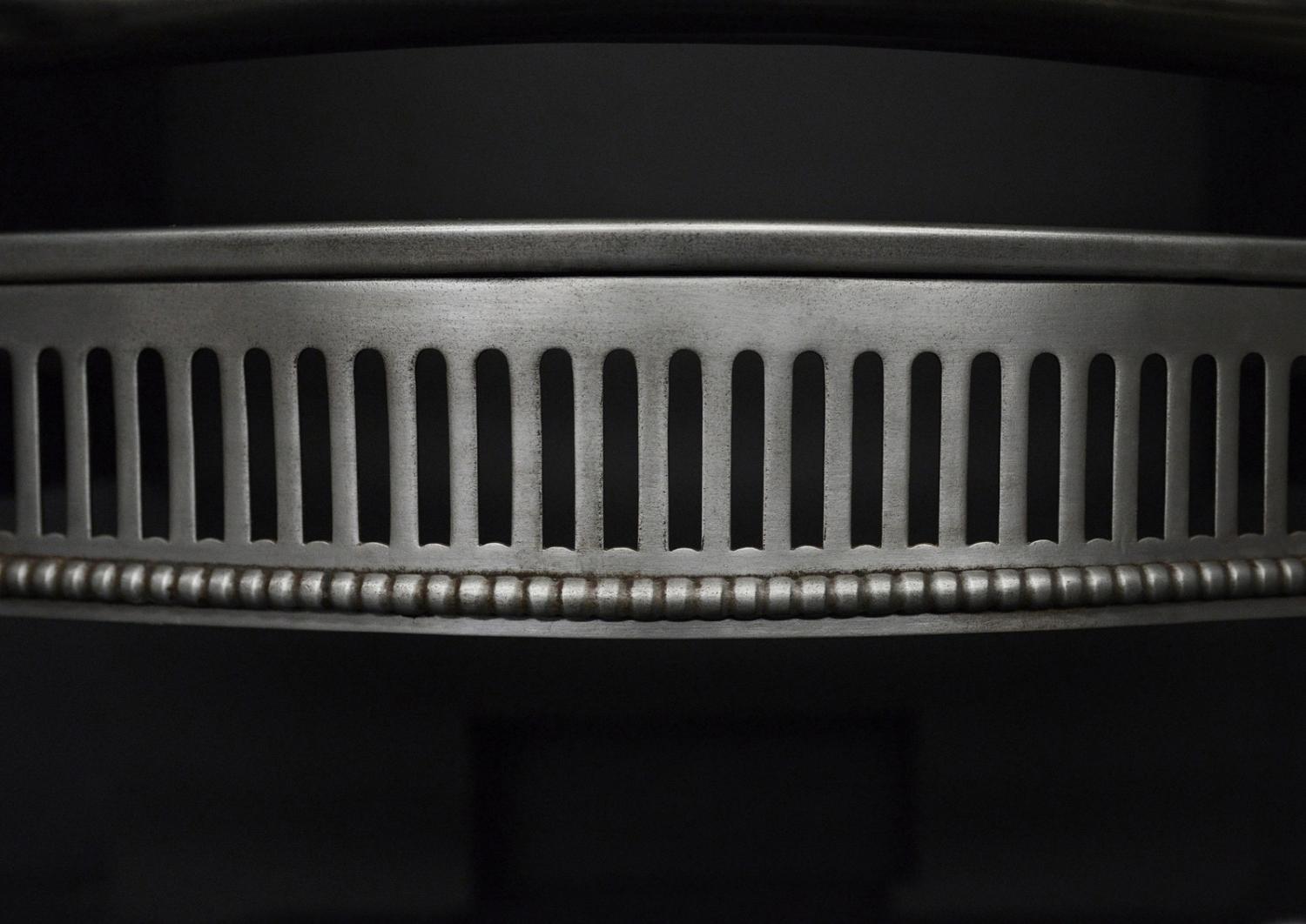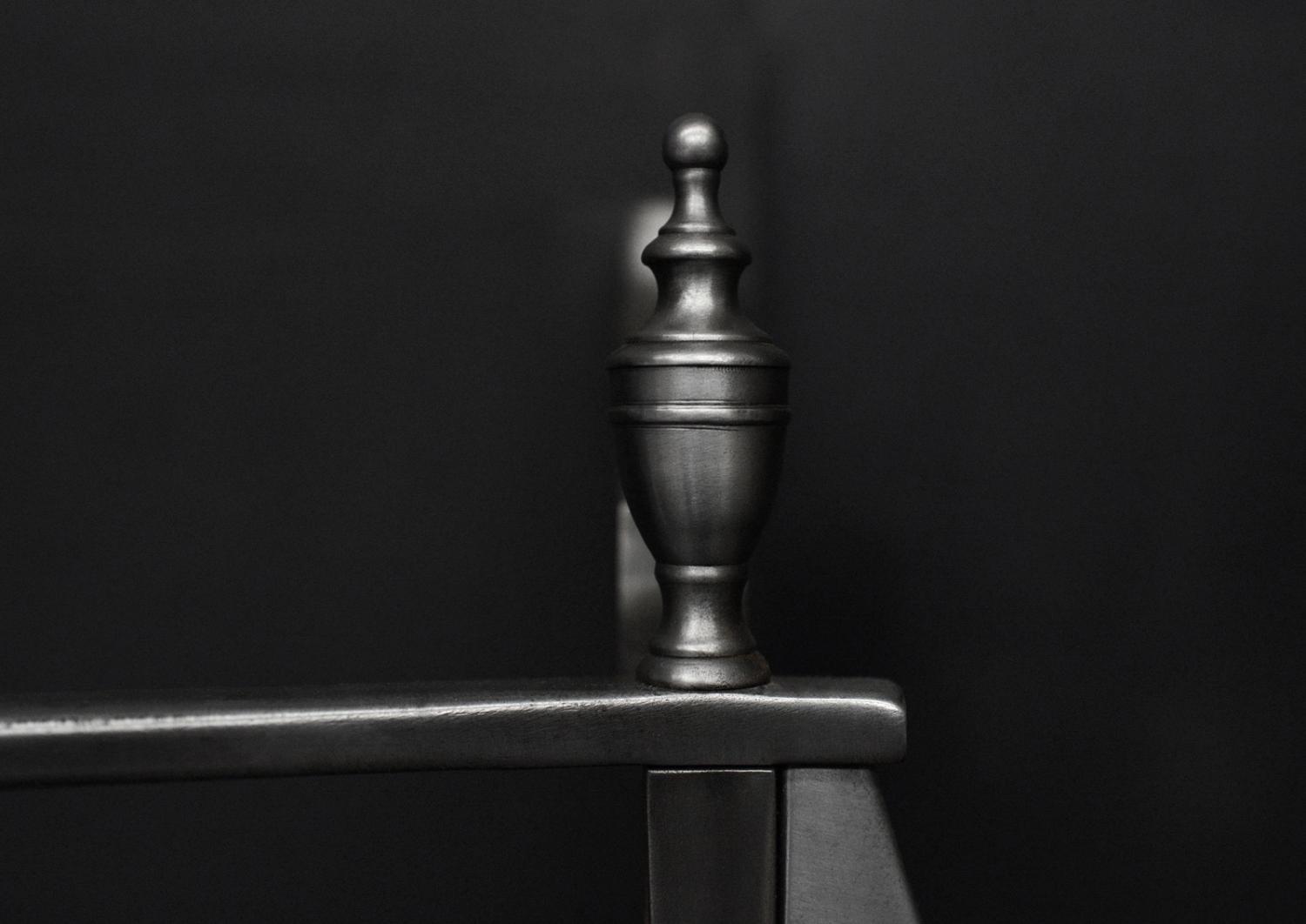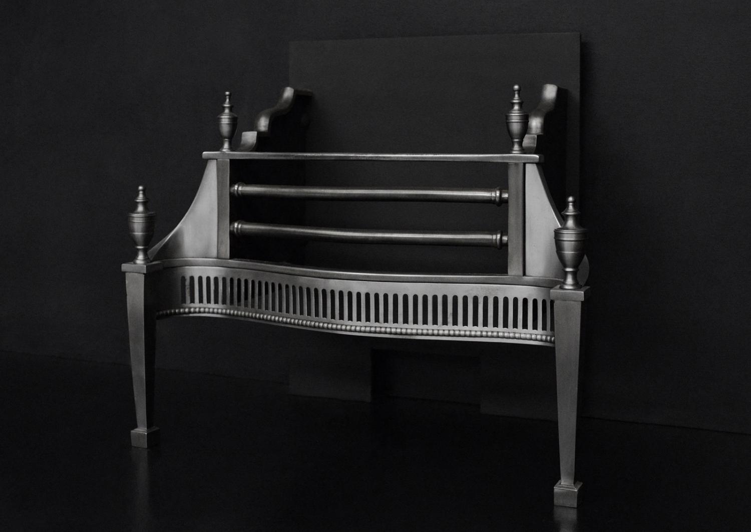 A polished steel firegrate in the Georgian style. The tapering legs surmounted by classical urn finial, the burning area with bowed front bars with fluted and beaded fret below. Plain fireback to rear. English.