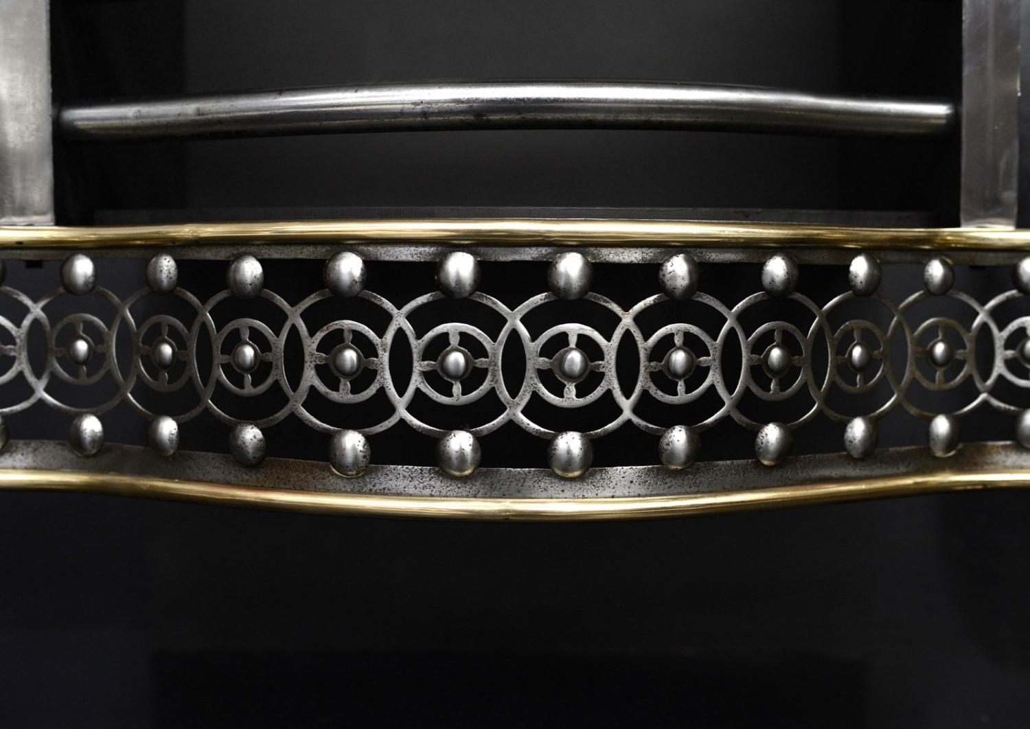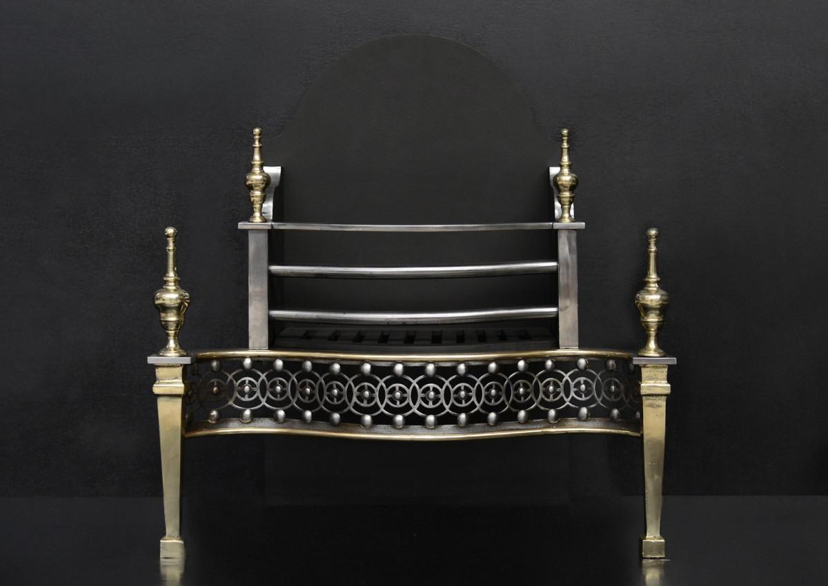 A George III style cast iron and brass firegrate. The tapering legs surmounted by elegant brass finials. The serpentine steel fret with guilloche pattern throughout and polished steel front bars above. Arched fireback to rear. English, circa 1900.
