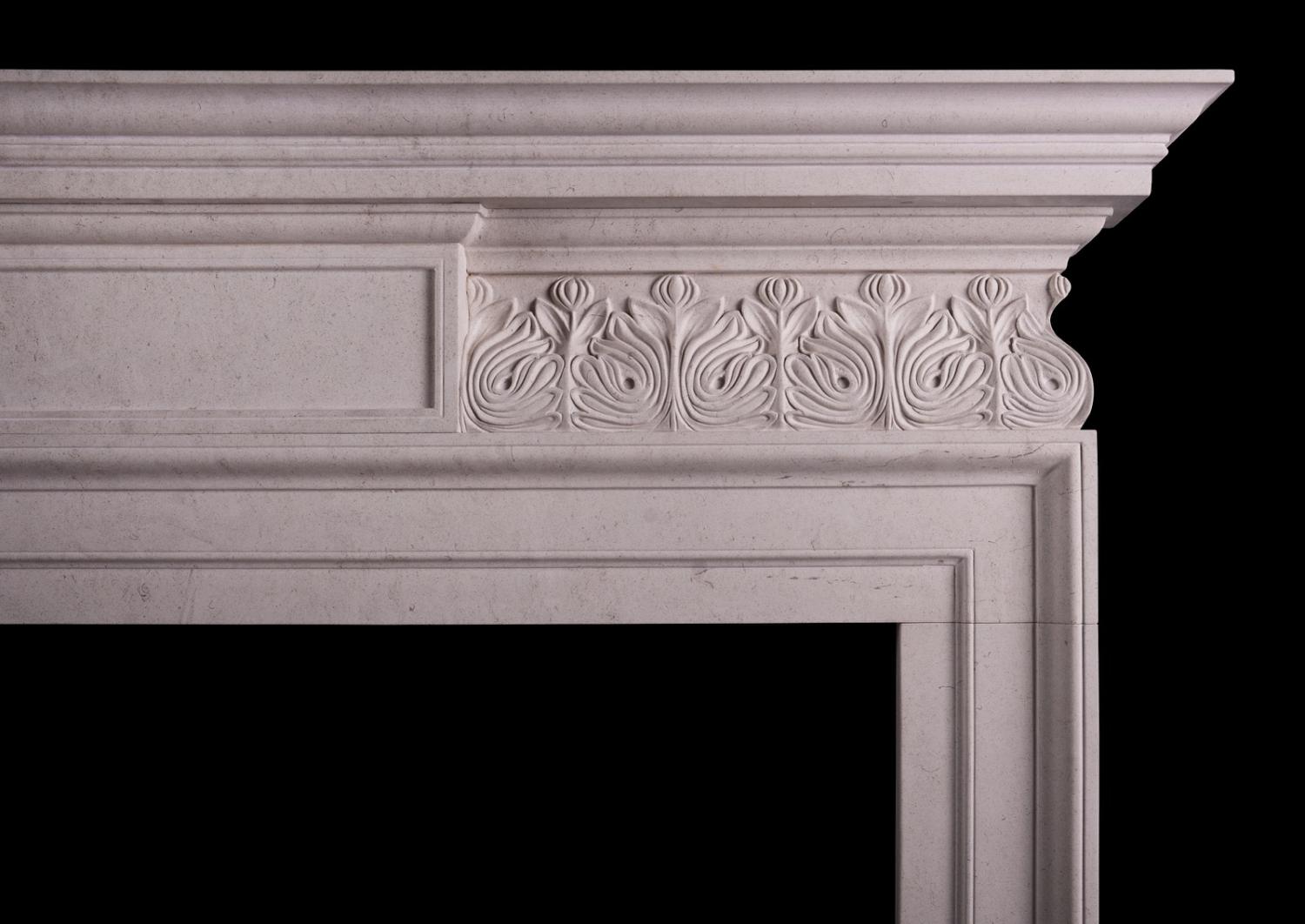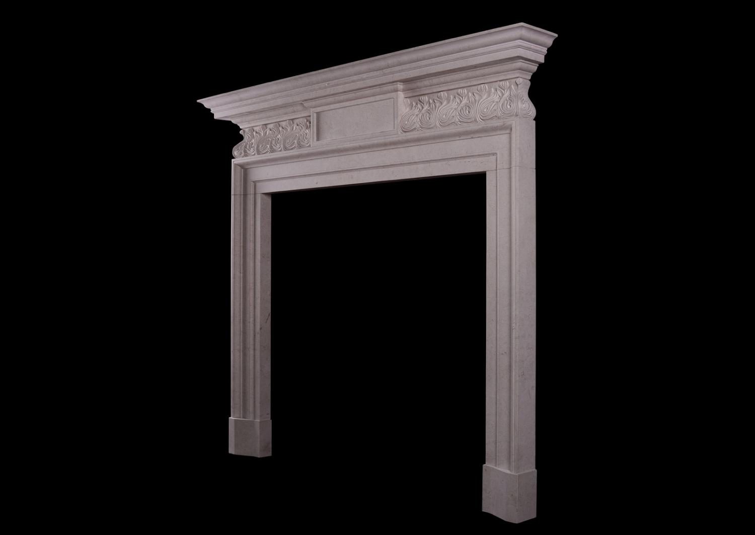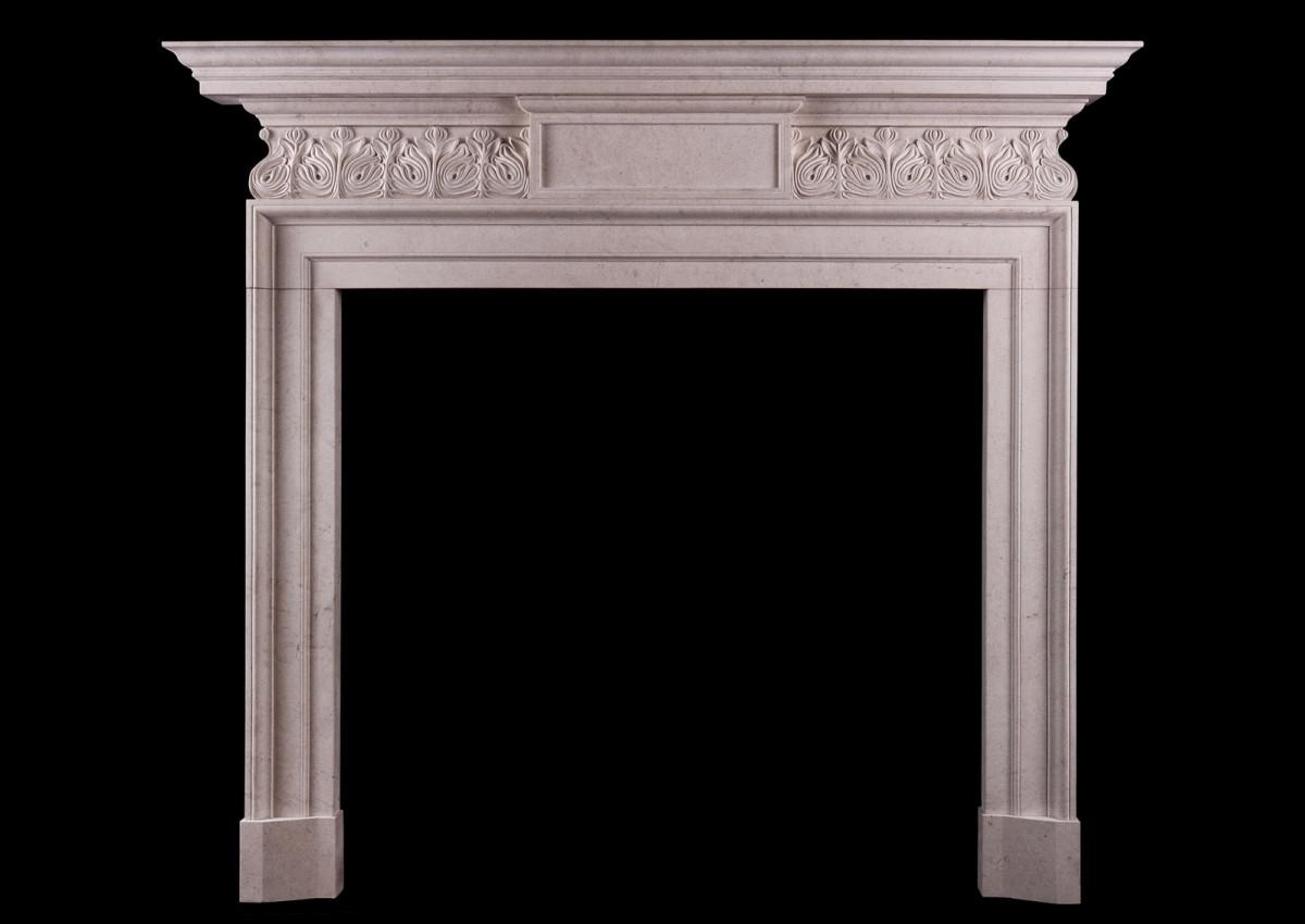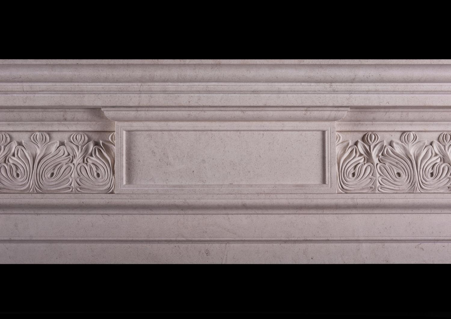 An elegant English George II style fireplace in Moleanos limestone. The carved frieze with leaf motif and moulded centre panel, surmounted by moulded shelf. A fine quality copy of a period piece. N.B. May be subject to an extended lead time, please enquire for more information.