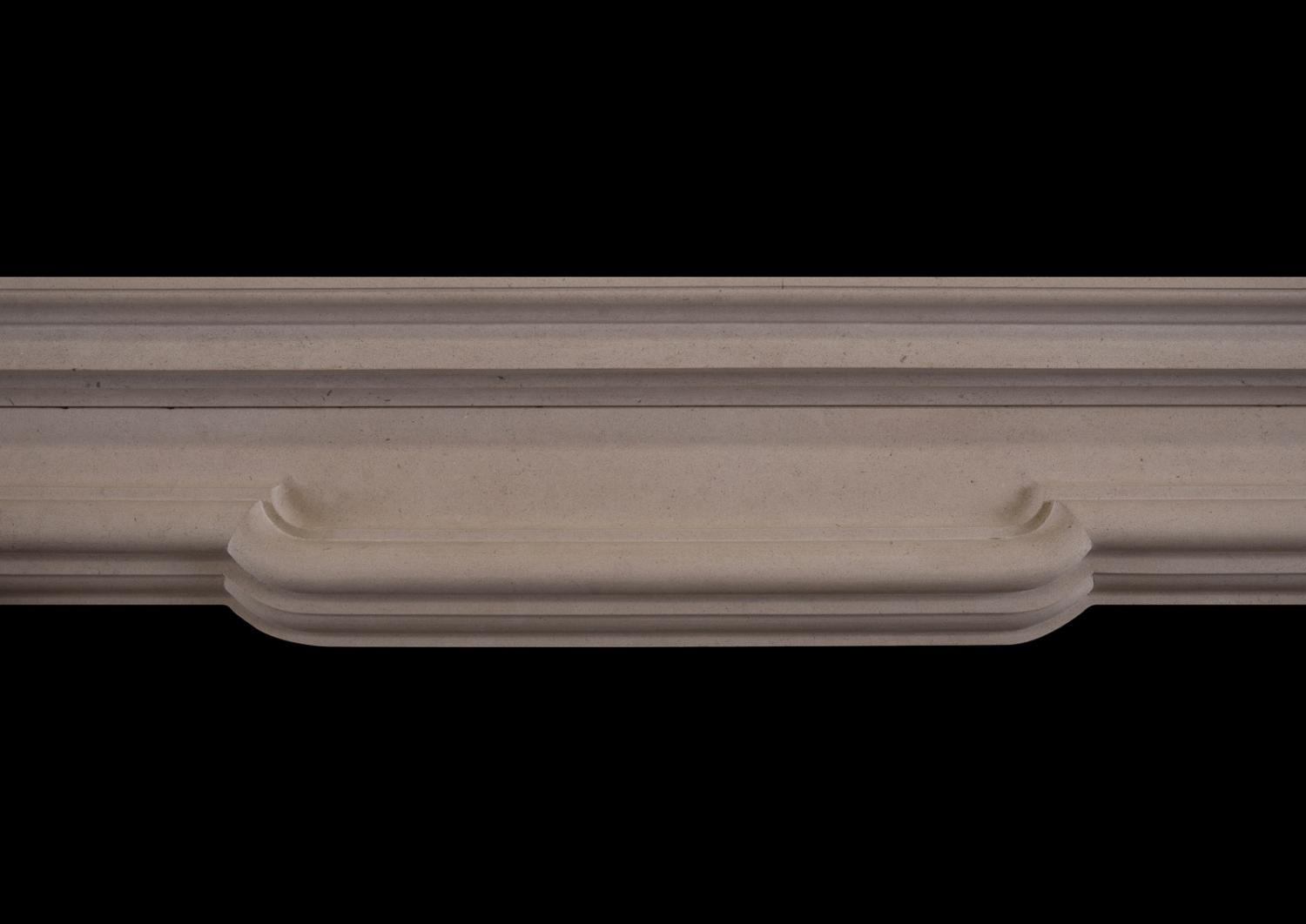 A good quality Italian fireplace in the Baroque manner in Portland stone. The shaped frieze with heavy moulding and breakfront shelf above. A substantial piece. Modern.