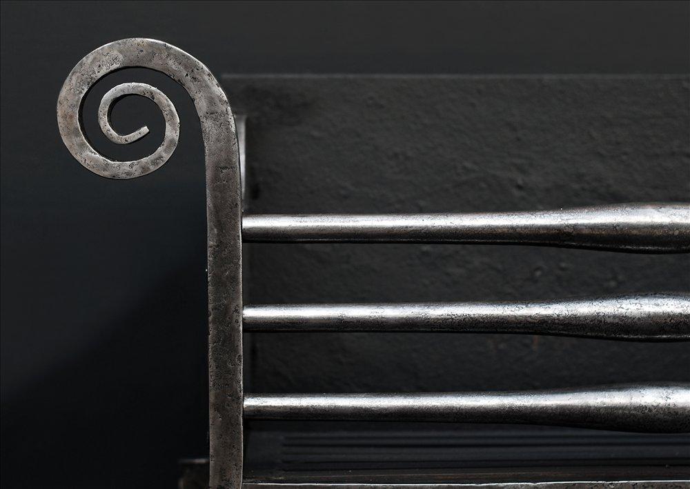 A large polished English wrought iron firegrate with decorative scrolls to feet and tops. The ample burning area contained by three shaped bars to front and cast iron back plate behind. Arts and Crafts style. N.B. May be subject to an extended lead time, please enquire for more information.