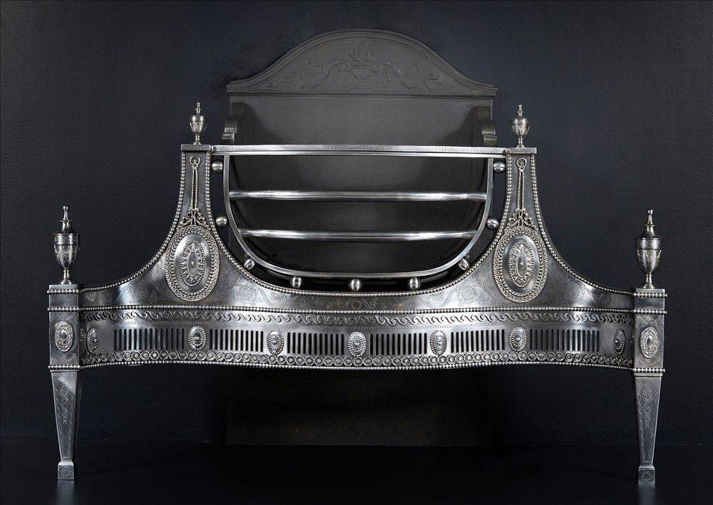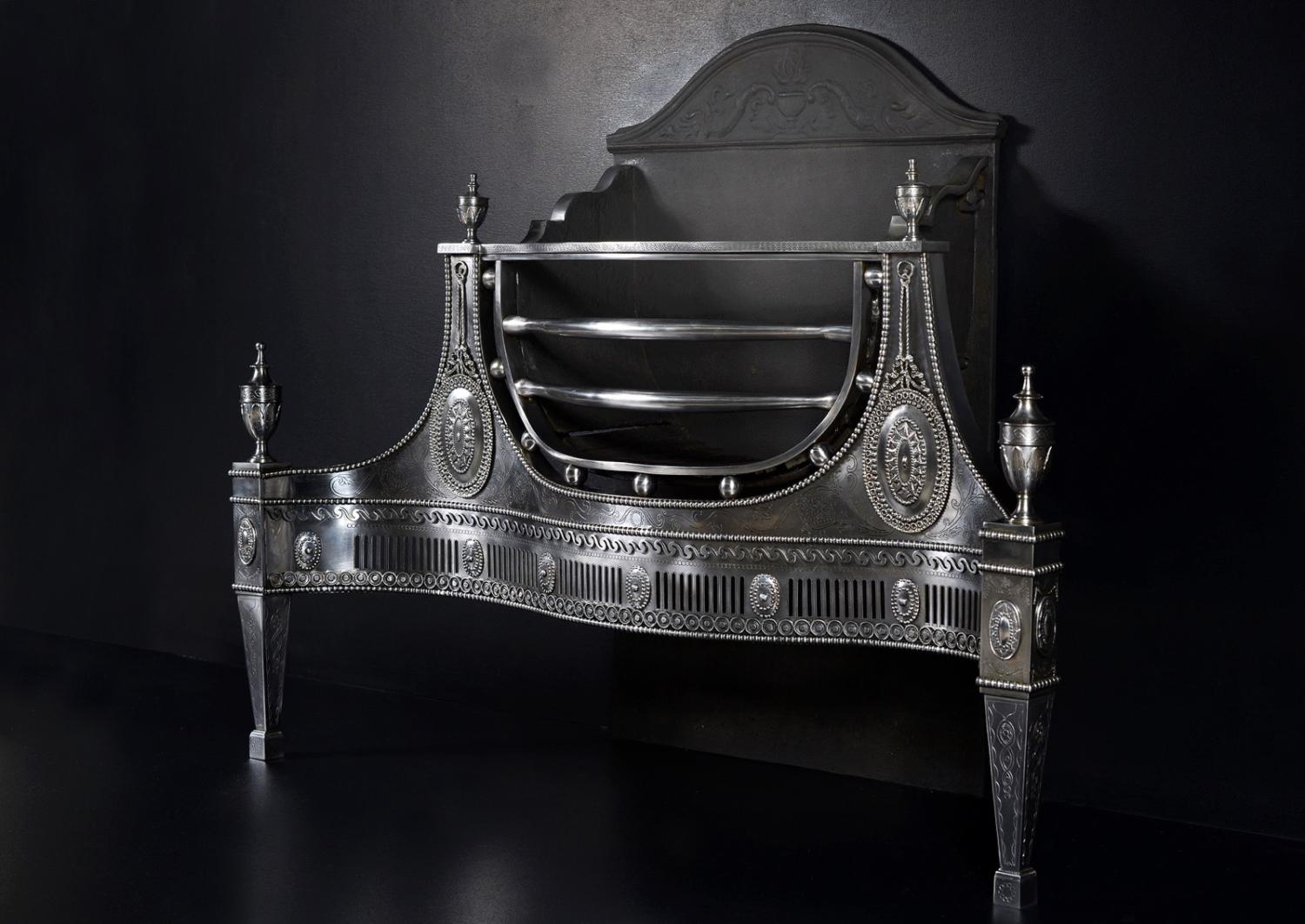A large and impressive Adam style steel firegrate. The cast fret with flutes and oval paterae, with scrolling and beading above and below. The engraved legs surmounted by elegant finials of water leaves, the front section with large oval adornments with beading and cascading ribbons above. The elliptical burning area with bowed steel front bars, engraved top bar and decorative balls below. Shaped cast iron back with urn, flames and quivers. Modern. NB. May be subject to extended lead time - please enquire.