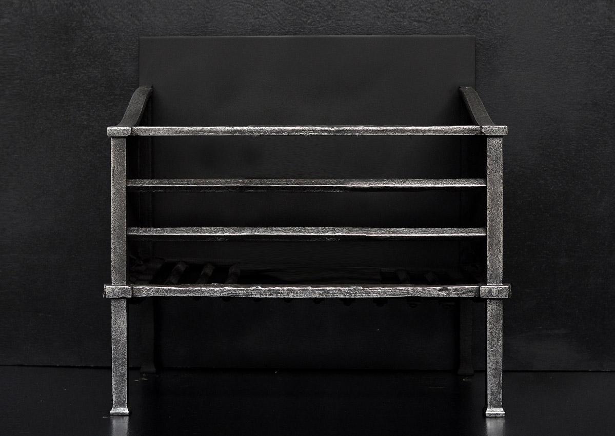A simple antiqued steel firegrate of architectural form. Square uprights with shaped returns to plain steel fireback. Reproduction. A larger version is also available - Stock No. RFG040L-ATQ. (N.B. May be subject to an extended lead time, please enquire for more information.)