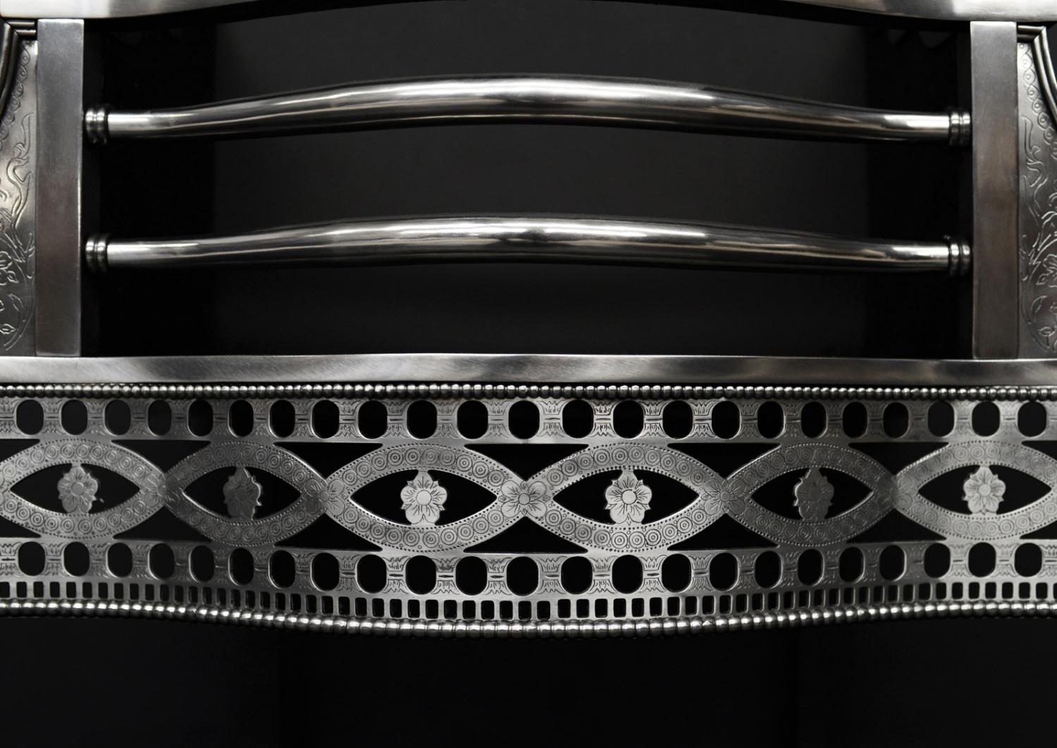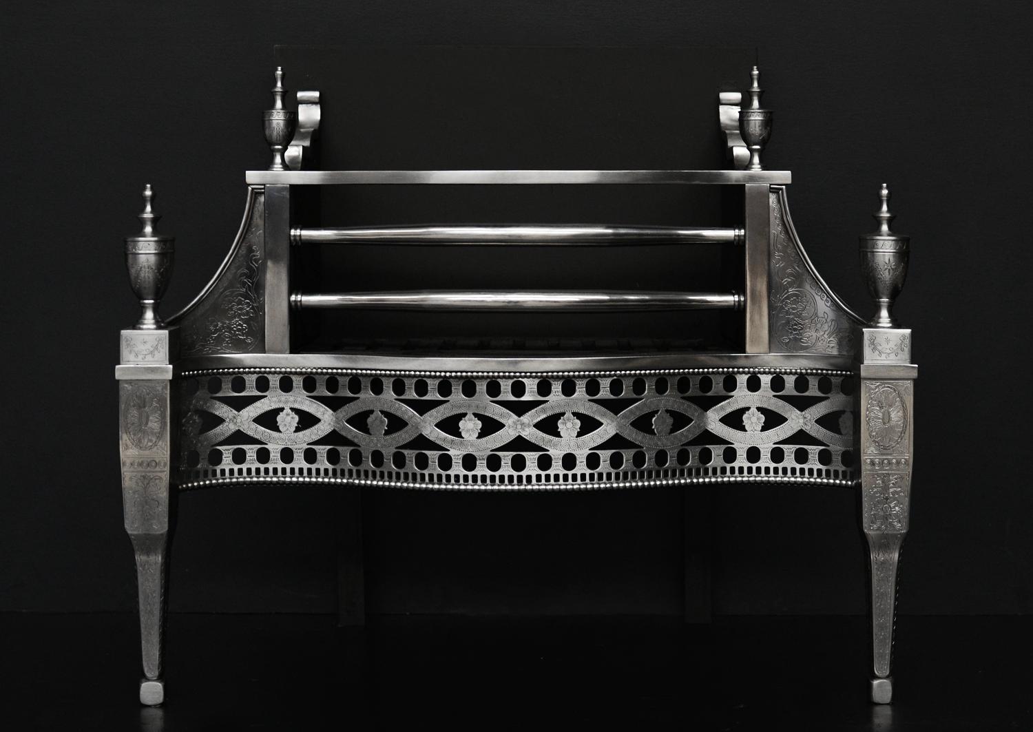 A very fine quality Georgian style firegrate in polished steel. The tapering legs with bell drop and rosette engraving, surmounted by urn finial with guilloche detailing. The pierced fret with beading to top and bottom and floral motifs and drapery throughout. The burning area with bowed cast iron front bars surmounted by urn finials. Plain iron back behind. English, modern. Also available in polished brass, Stock No. RFG052-B N.B. May be subject to an extended lead time, please enquire for more information.