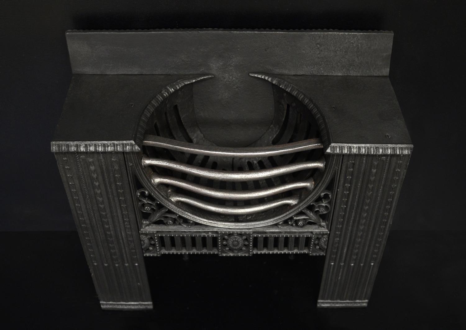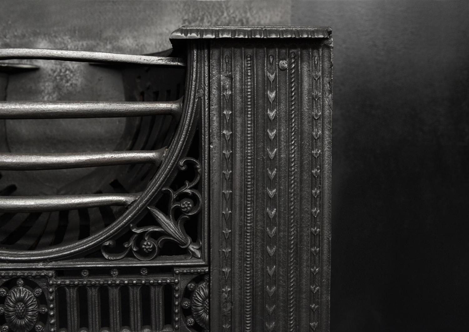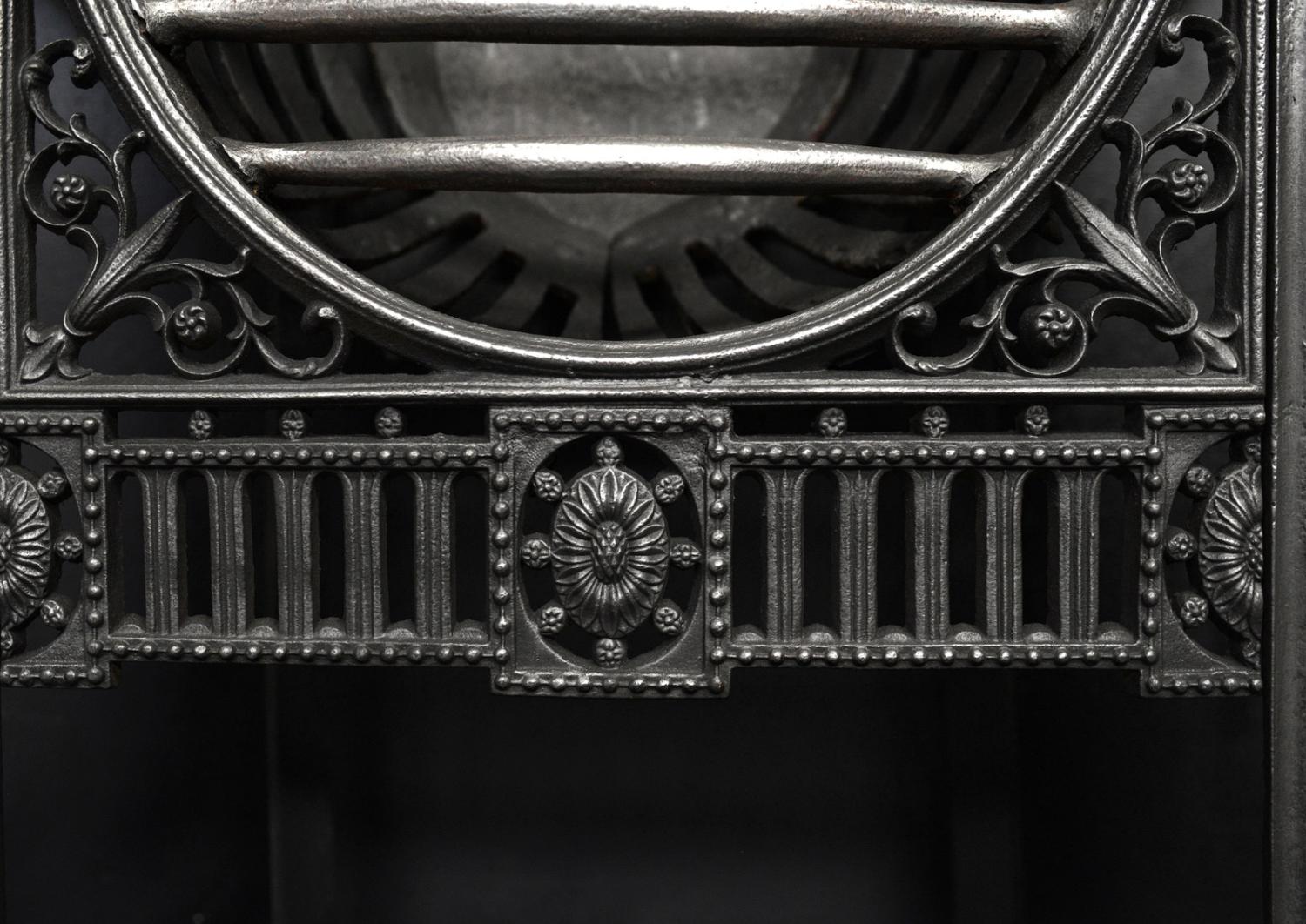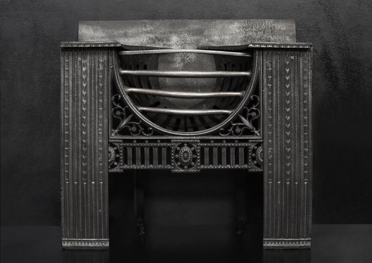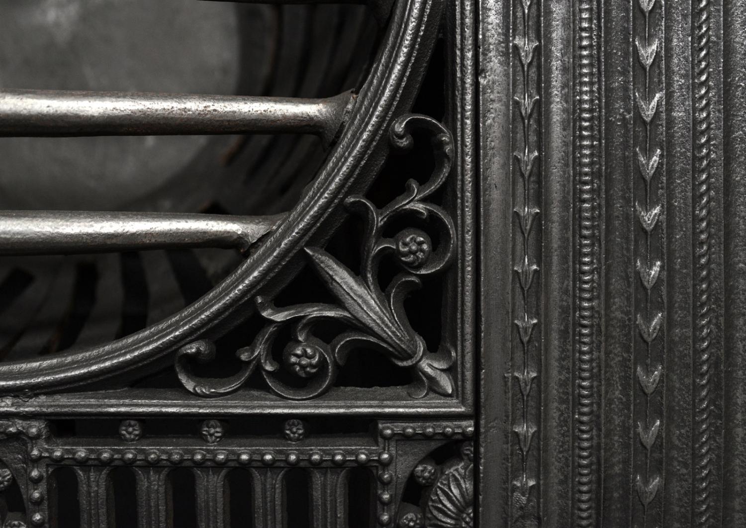 A fine quality hob grate. The bowl shaped burning area with ornately cast foliage and fret below. Decorative front panels. English, 19th century.