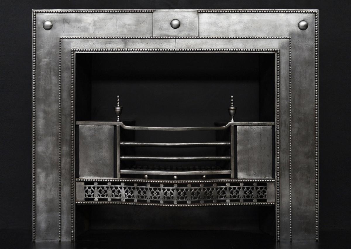 A fine quality late 18th-century steel register grate, in the manner of Robert Adam, richly engraved with archetypal neo-classical ornament including foliate swags, Grecian urns, drops, and ribbon motifs. The pierced ash fret is of geometric and foliate pattern, surmounted by bowed front bars and urn finials, reinforcing the restrained classical character of the piece. The engraving throughout is lightly but confidently cut, typical of a high-quality workshop rather than mass production. The surround is centred with a raised rectangular panel, flanked by plain round paterae to the upper corners, and is finely detailed with a beaded moulding running to both the outer and inner edges, creating a crisp architectural frame.