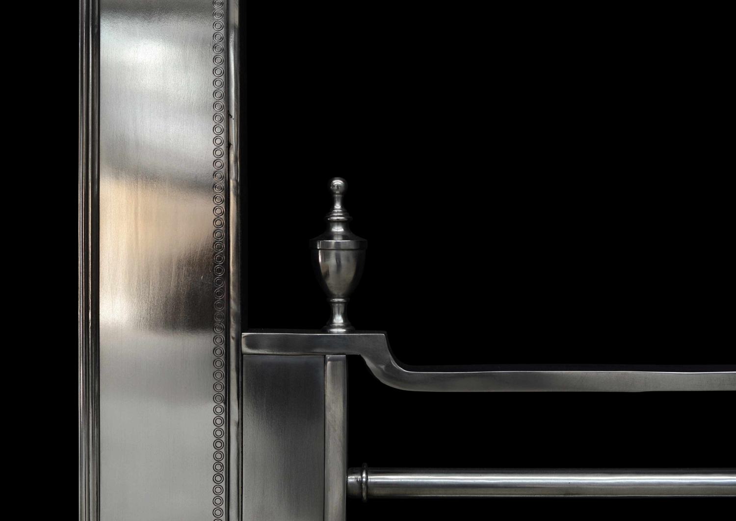 A fantastic quality copy of a mid 18th century Irish register grate in steel. The pierced, engraved fret surmounted by wrought iron bars and steel finials. The steel frame with fine engraving and round paterae to top. N.B. May be subject to an extended lead time, please enquire for more information.