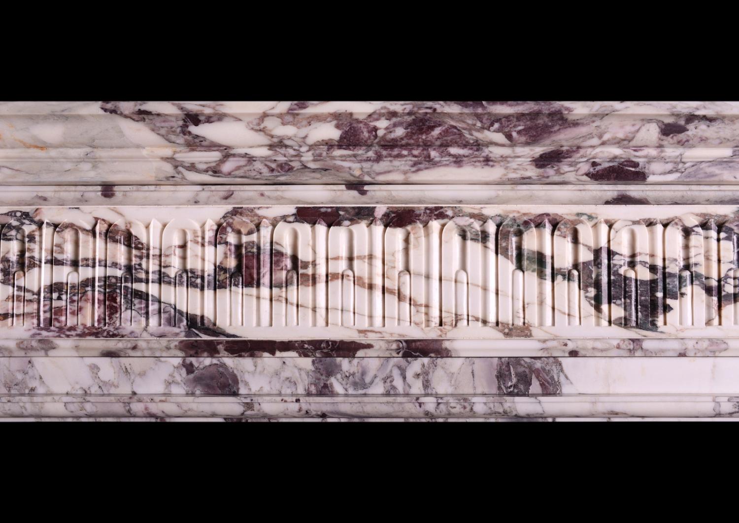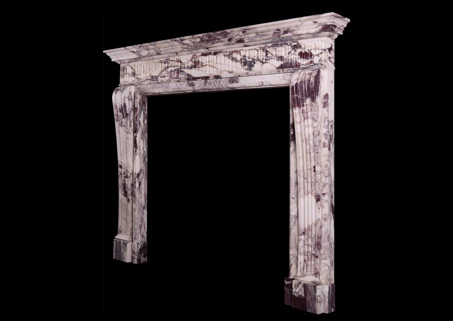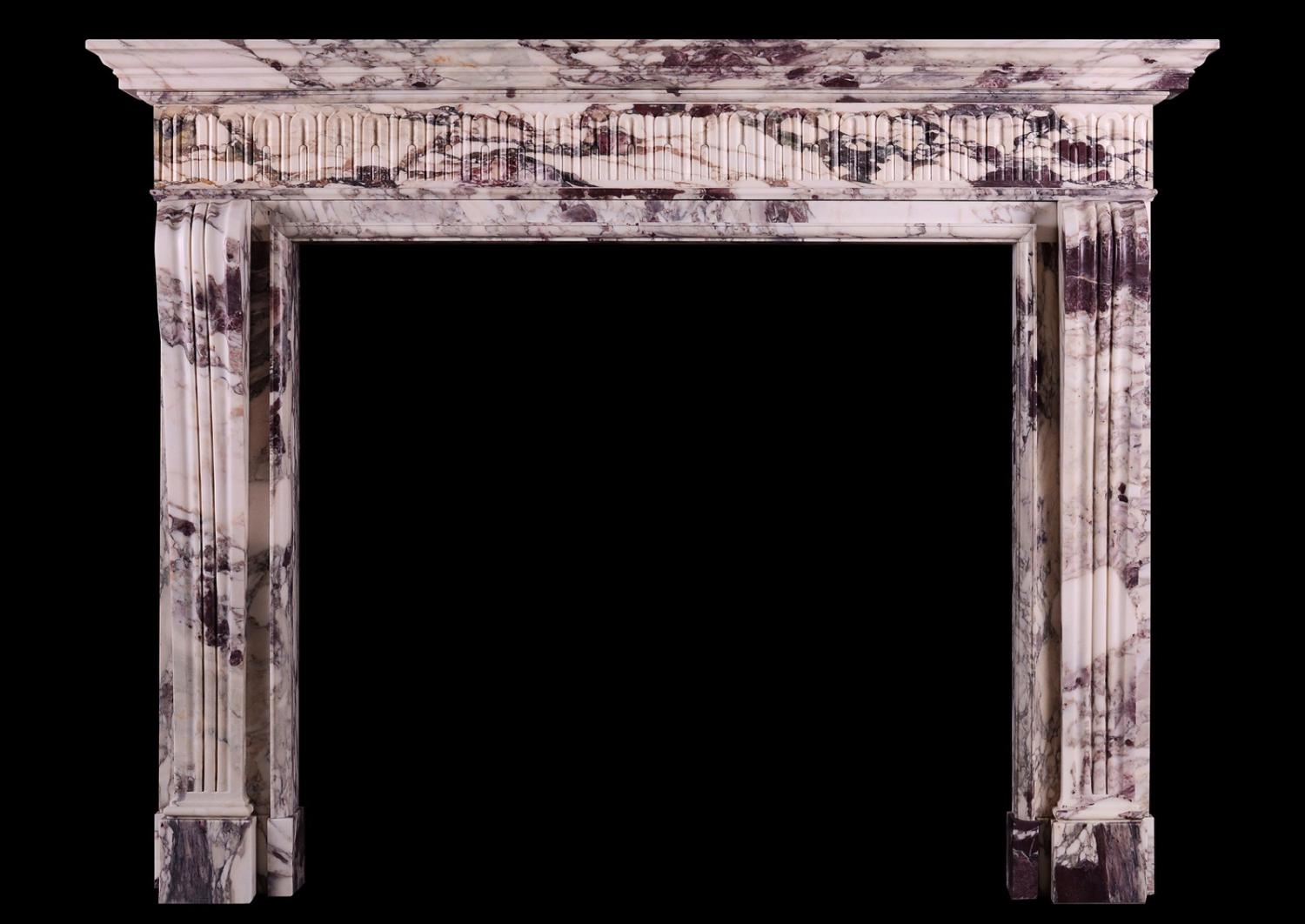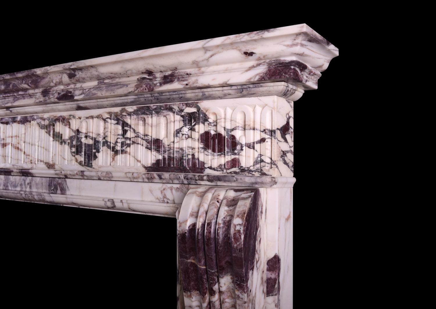 The Higham is a striking, detailed, quintessentially English Georgian style chimneypiece and part of the Todhunter Earle Interiors collaboration. The shaped, moulded jambs are surmounted by a frieze carved with intricate stop flutes and a moulded shelf above. The stock version of The Higham is made in Breche Violette - a rare and luxurious marble admired for its dramatic, fragmented appearance and rich colour palette. This chimneypiece could be made in custom sizes and stones/marbles. Please enquire for more info and pricing. N.B. May be subject to an extended lead time, please enquire for more information.